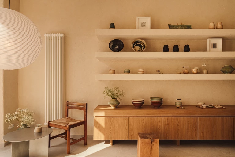 W studiu dominują jasne odcienie beżu, pasujące do stylu ceramiki ATO. Szorstkie ściany zestawiono z ciepłem naturalnego dębu, widocznym na długiej komodzie, umiejscowionej poniżej półek. Z dębu wykonano także ladę, która stanowi serce lokalu. Mebel powstał w technice Adze zaczerpniętej z japońskiej snycerki. Blat zdobi plisowana lampa „Matin” marki HAY.