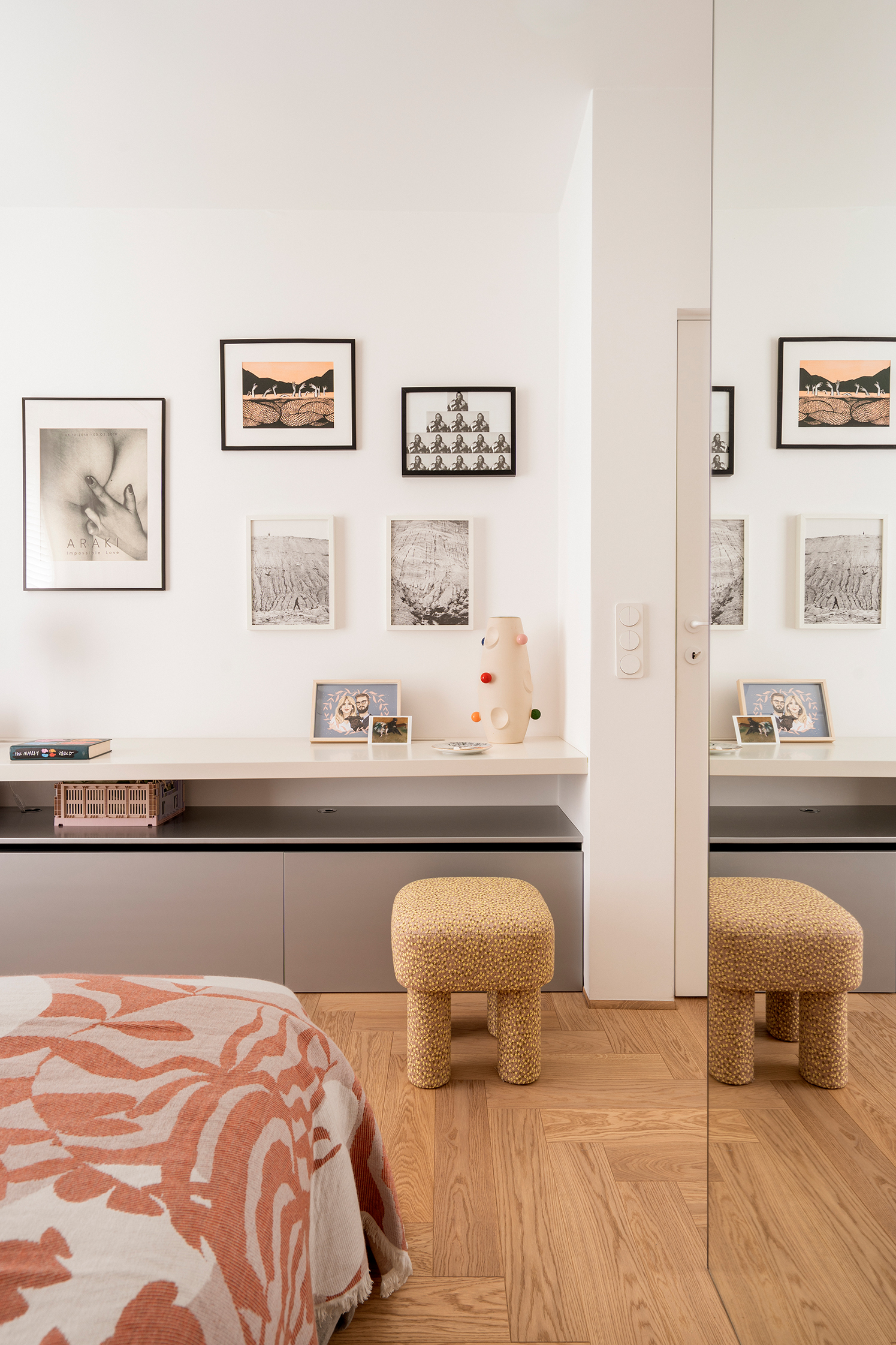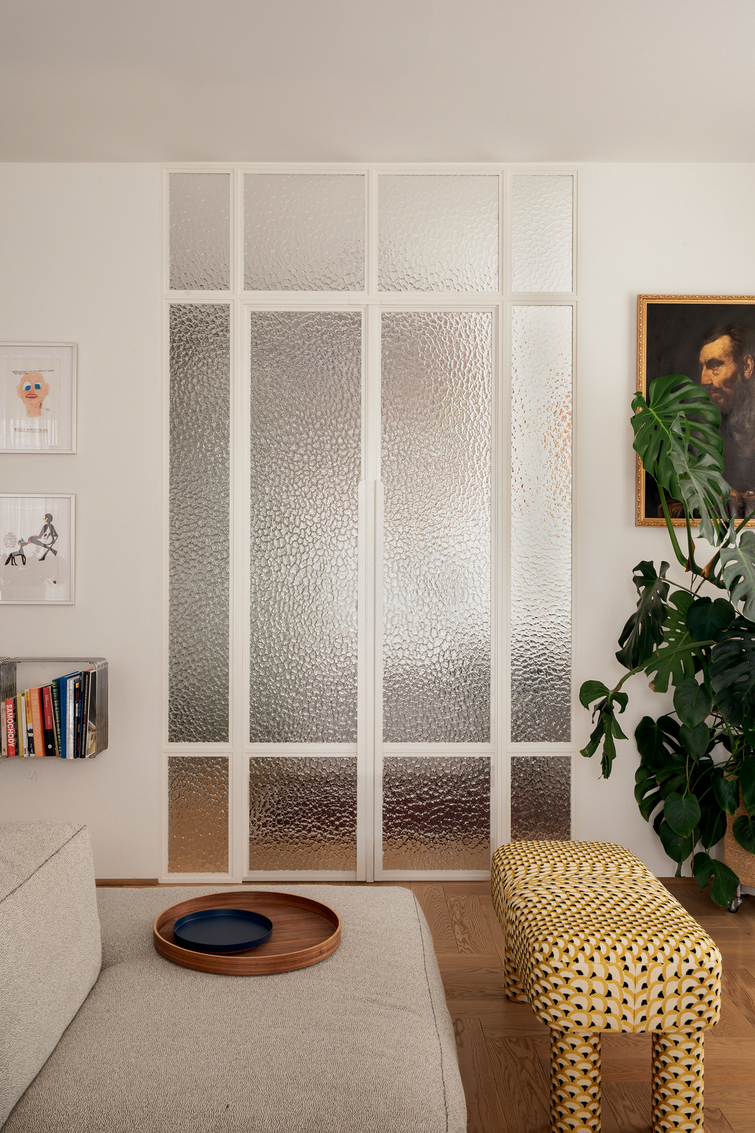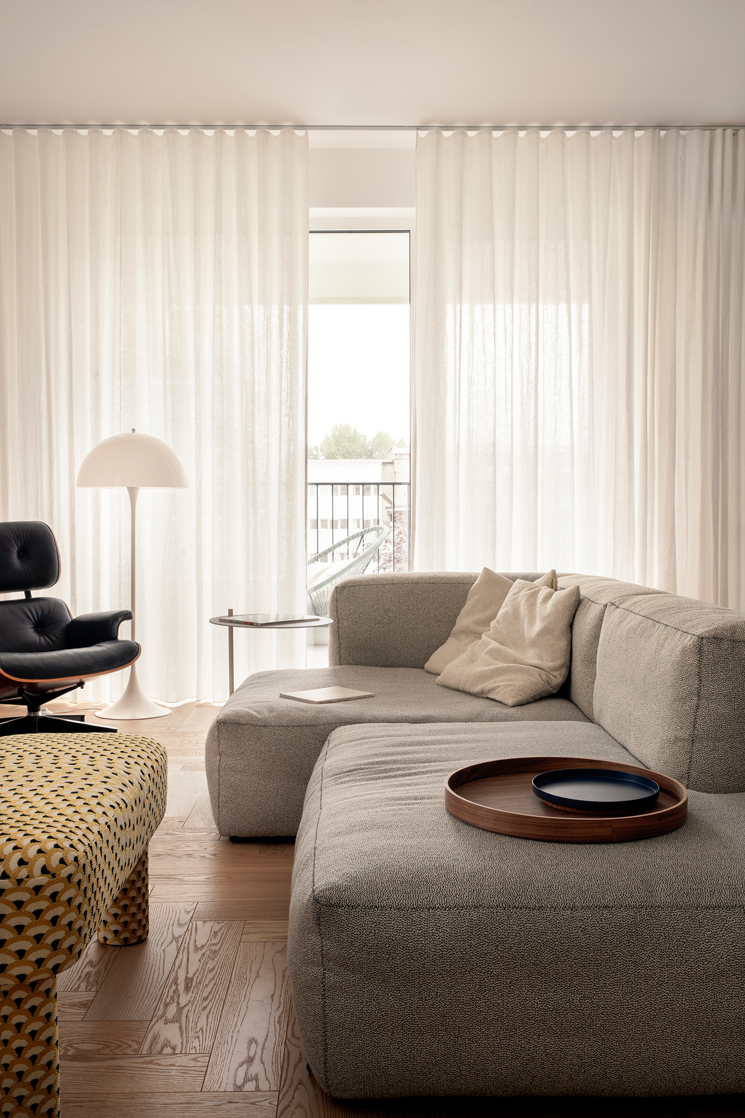 Obecność wysokiej jakości wzornictwa i sztuki wynika z zawodowych pasji właścicielki, która na co dzień pracuje jako konserwator w warszawskiej Zachęcie. W mieszkaniu znalazły się unikatowe „smaczki” wykonane przez artystkę Sylwię Biegaj. Jej autorstwa są m.in. ława w salonie obita żakardem od Pierre Frey oraz pufa w sypialni, do której wykończenia użyto wełny z kolekcji Kvadrat Raf Simons.