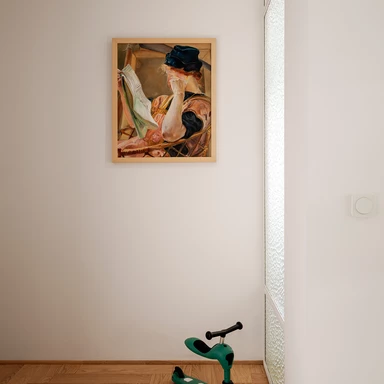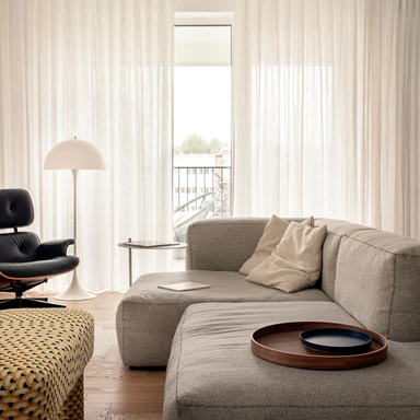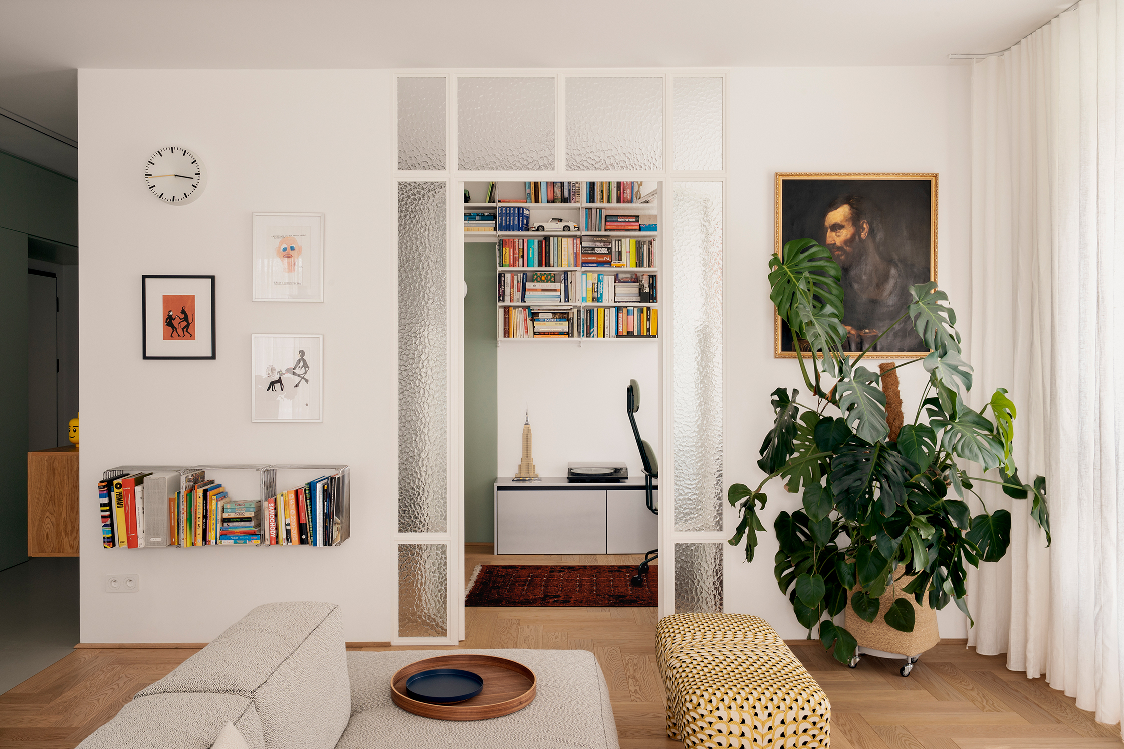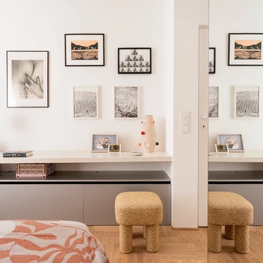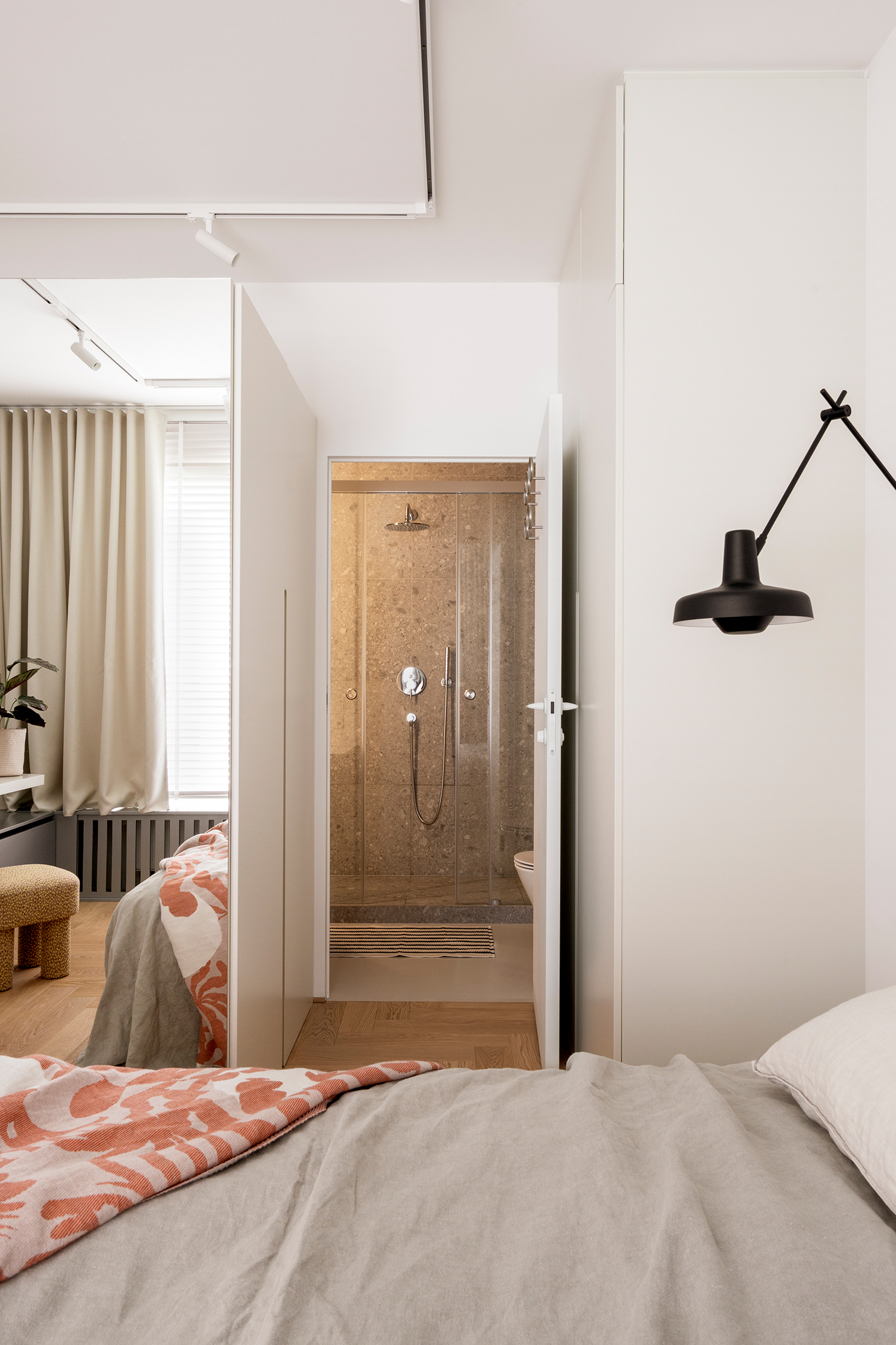 Obecność wysokiej jakości wzornictwa i sztuki wynika z zawodowych pasji właścicielki, która na co dzień pracuje jako konserwator w warszawskiej Zachęcie. W mieszkaniu znalazły się unikatowe „smaczki” wykonane przez artystkę Sylwię Biegaj. Jej autorstwa są m.in. ława w salonie obita żakardem od Pierre Frey oraz pufa w sypialni, do której wykończenia użyto wełny z kolekcji Kvadrat Raf Simons.