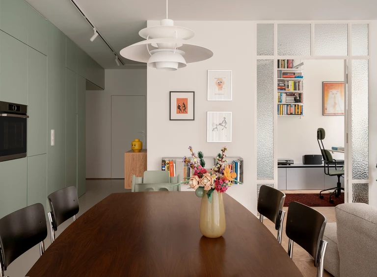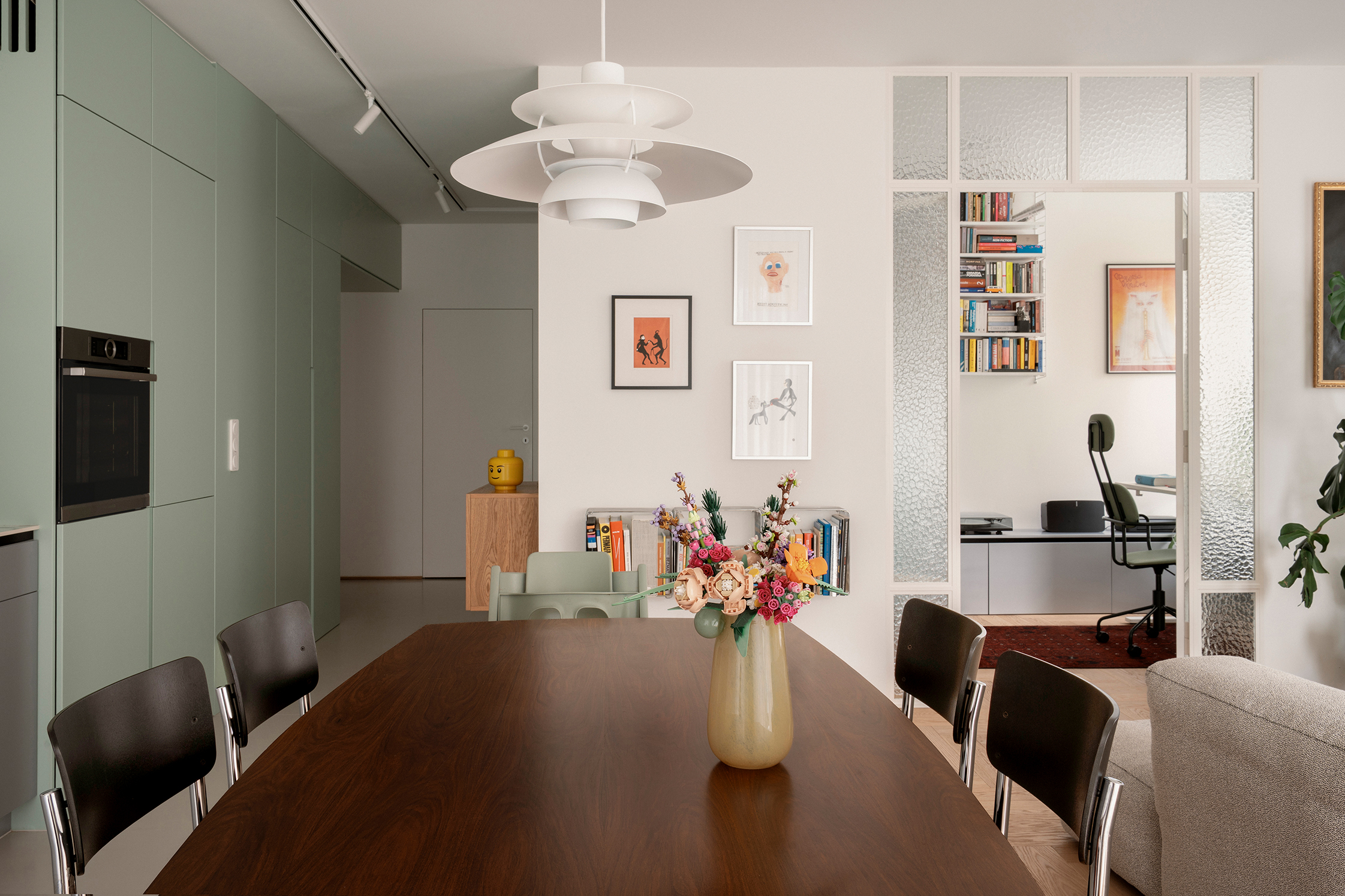 Podobna wytrwałość towarzyszyła poszukiwaniom stołu do jadalni. Ponieważ na tym samym osiedlu zamieszkała duża grupa ich znajomych, priorytetem był mebel, który pomieści wielu gości, a jednocześnie będzie autentycznym elementem vintage. Po miesiącach poszukiwań udało się znaleźć stary, duży stół, który wraz z krzesłami Thonet tworzy serce domu.