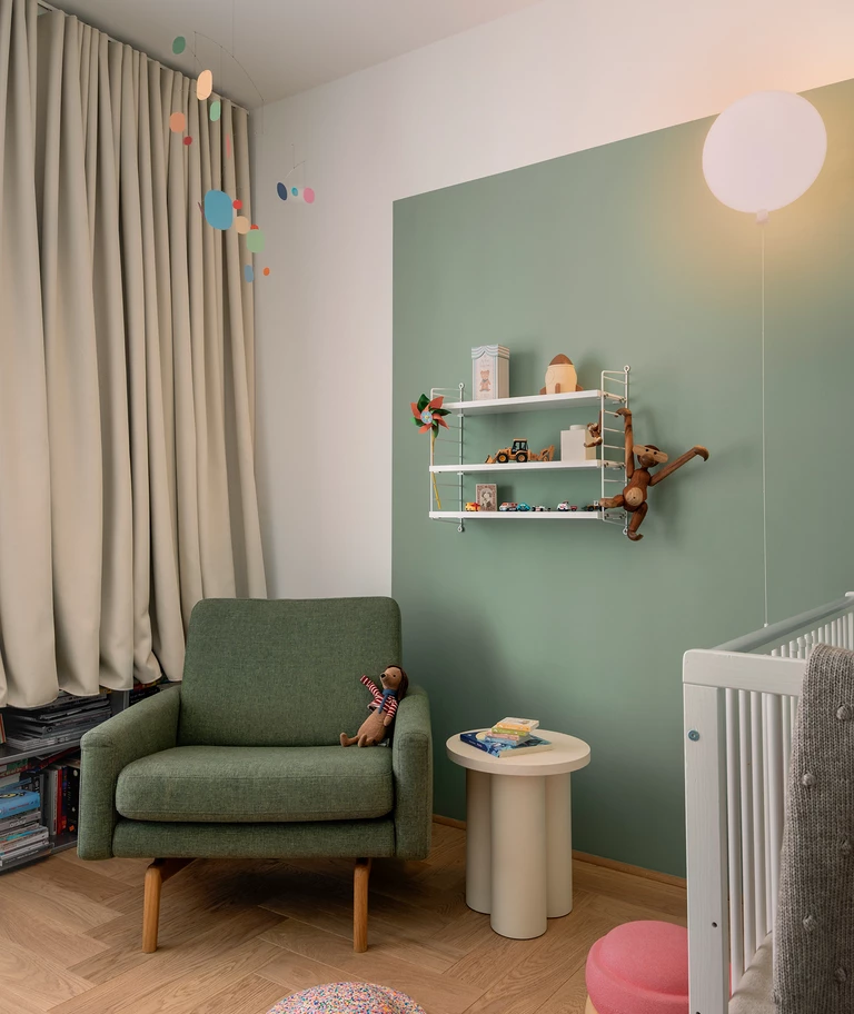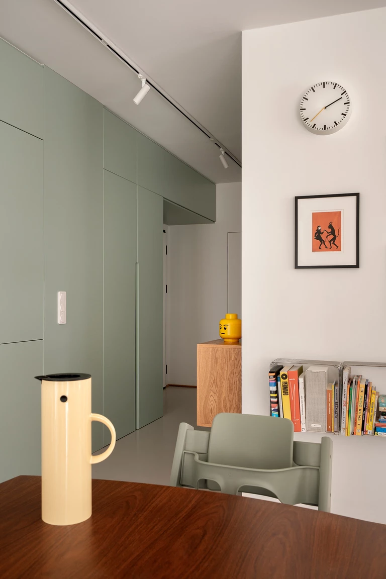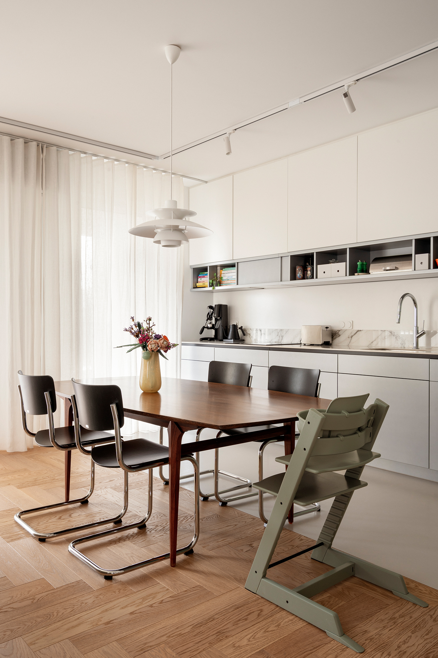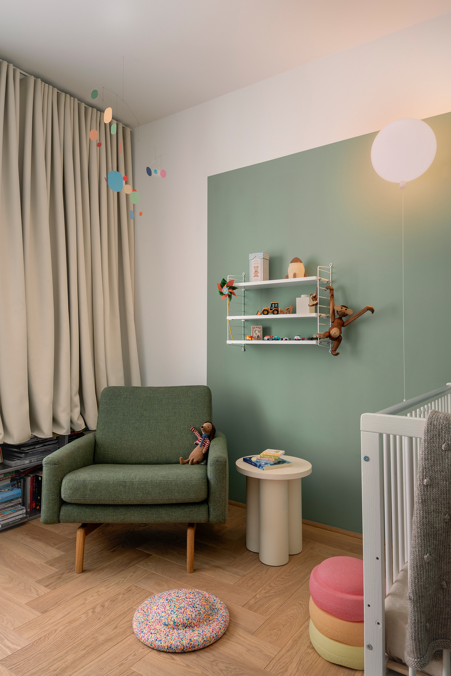 Mieszkanie o powierzchni około 92 metrów kwadratowych zostało zaplanowane w momencie, gdy para oczekiwała pierwszego dziecka. Głównym celem było stworzenie oazy spokoju przed nadchodzącą rewolucją w ich życiu. Aby zapanować nad wizualnym chaosem, który naturalnie pojawia się przy małym dziecku, projekt oparto na rygorystycznym zminimalizowaniu palety materiałowej i trzymaniu się konkretnych linii kompozycyjnych. Taka dyscyplina pozwala na zachowanie poczucia harmonii nawet wtedy, gdy na podłodze lądują klocki LEGO.