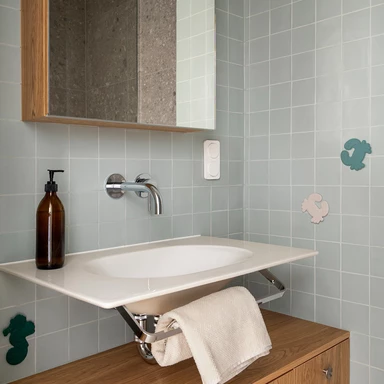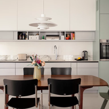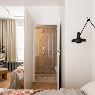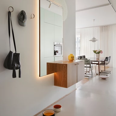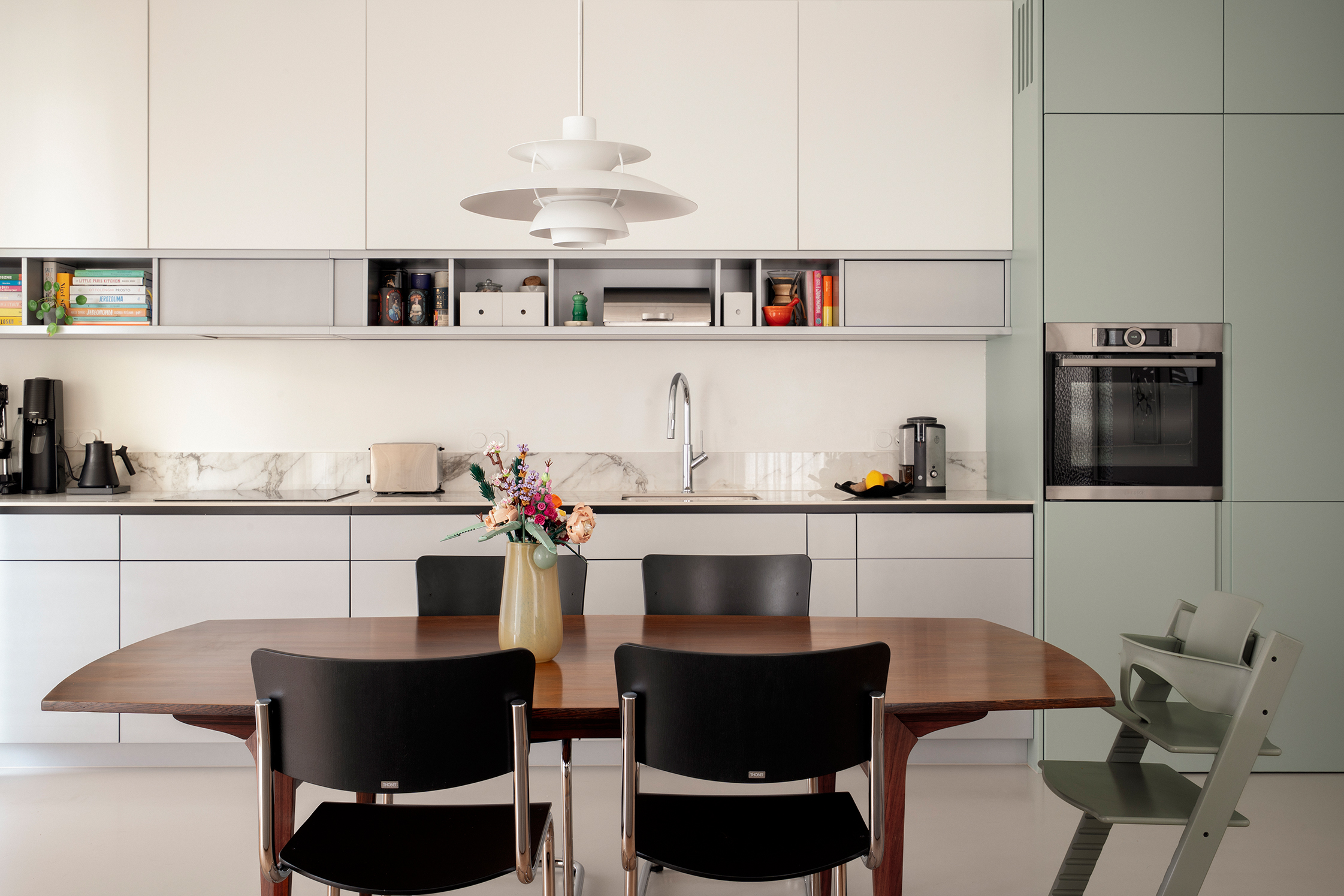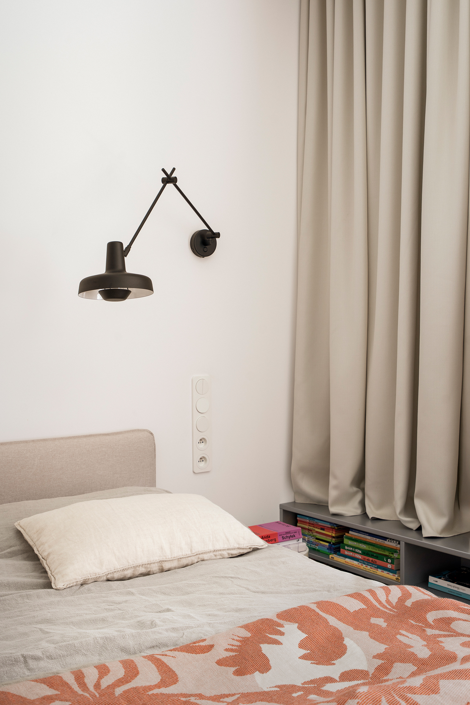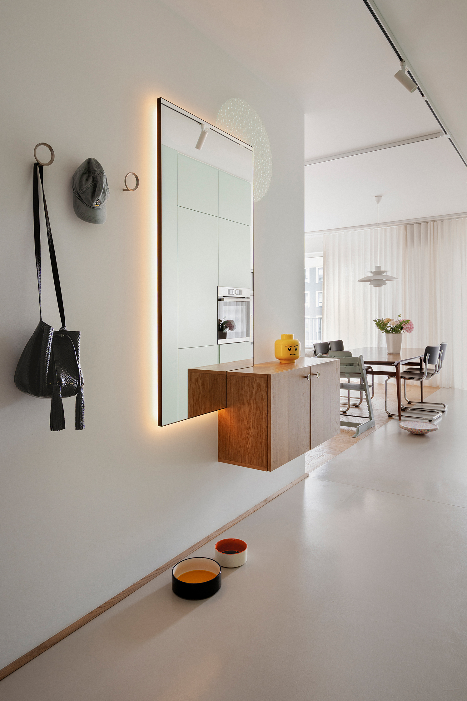 Mieszkanie o powierzchni około 92 metrów kwadratowych zostało zaplanowane w momencie, gdy para oczekiwała pierwszego dziecka. Głównym celem było stworzenie oazy spokoju przed nadchodzącą rewolucją w ich życiu. Aby zapanować nad wizualnym chaosem, który naturalnie pojawia się przy małym dziecku, projekt oparto na rygorystycznym zminimalizowaniu palety materiałowej i trzymaniu się konkretnych linii kompozycyjnych. Taka dyscyplina pozwala na zachowanie poczucia harmonii nawet wtedy, gdy na podłodze lądują klocki LEGO.