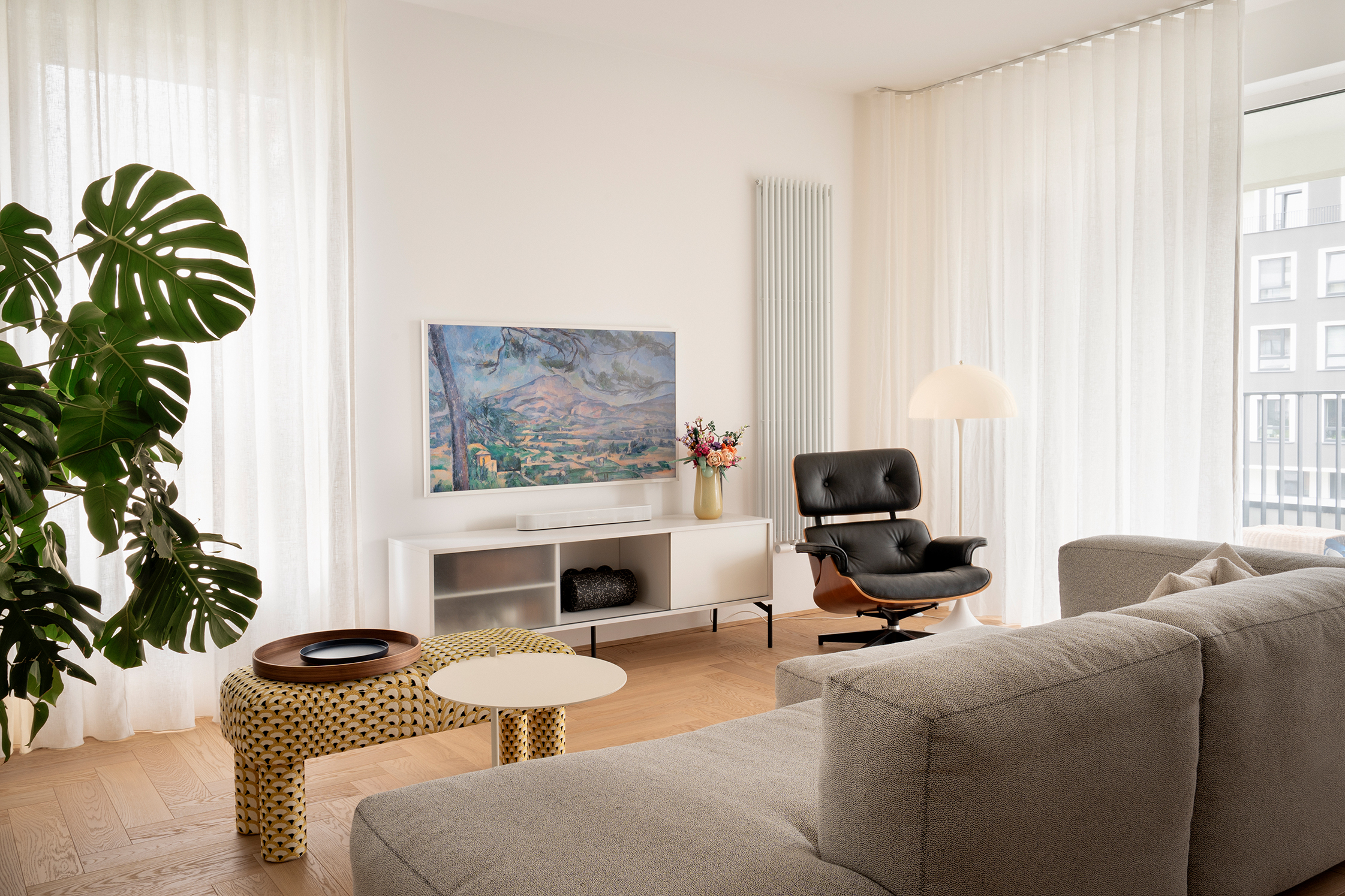 Wnętrze wypełniają przedmioty wyselekcjonowane z ogromną cierpliwością. Właściciele, zafascynowani historią wzornictwa, spędzili miesiące na analizowaniu kolejnych wersji produkcyjnych kultowego fotela Lounge Chair projektu Charlesa i Ray Eamesów. Ich determinacja pozwoliła na zdobycie oryginalnego egzemplarza w świetnym stanie, który stał się jednym z centralnych punktów salonu.