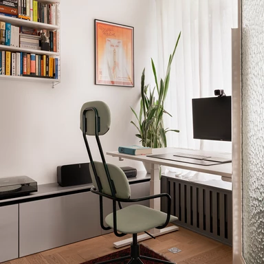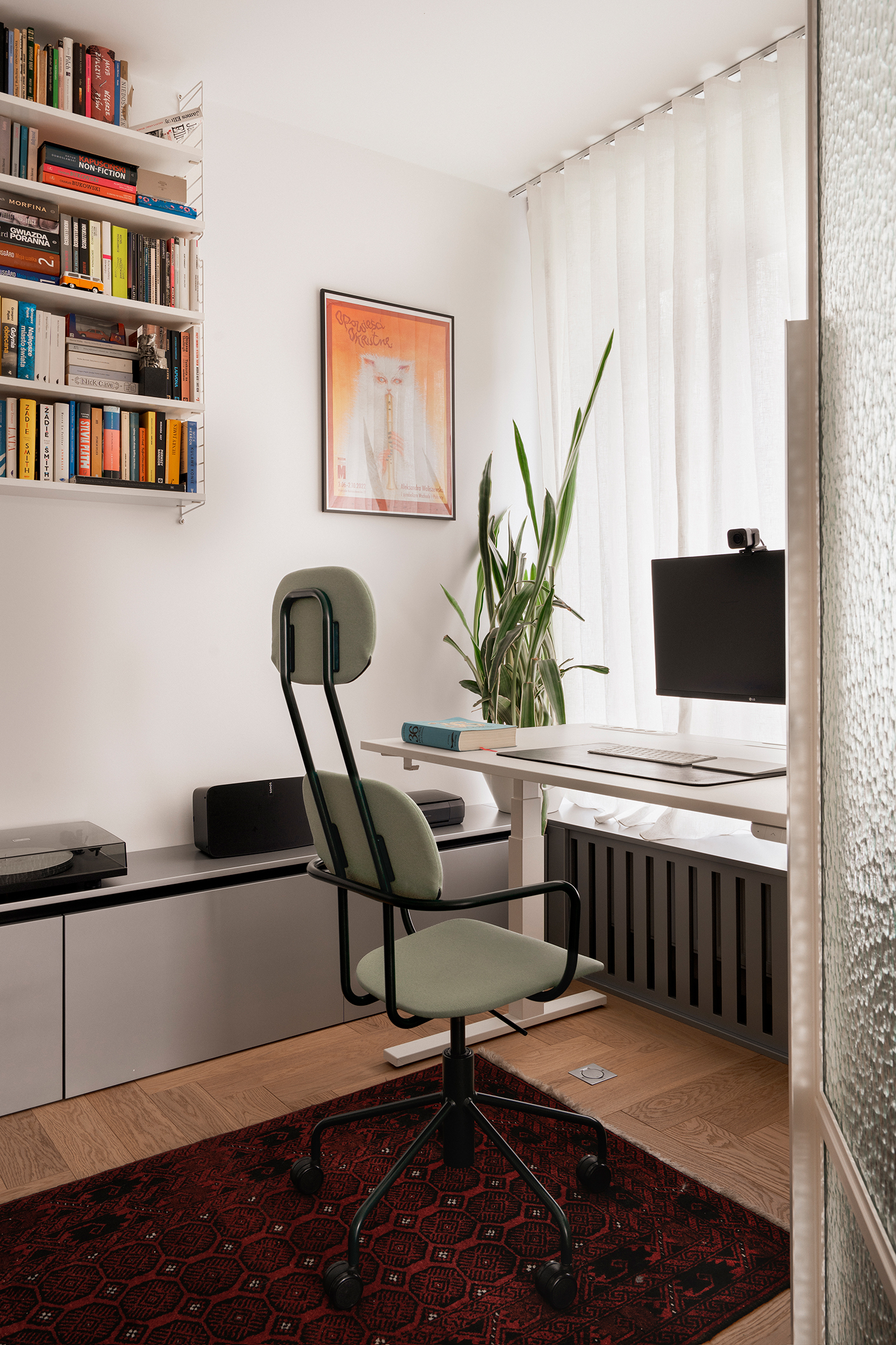 Ważnym aspektem funkcjonalnym było wydzielenie przestrzeni do pracy zawodowej. Ponieważ oboje rodzice pracują zdalnie, wnętrze musiało elastycznie dopasowywać się do ich zmieniających się w ciągu dnia obowiązków.