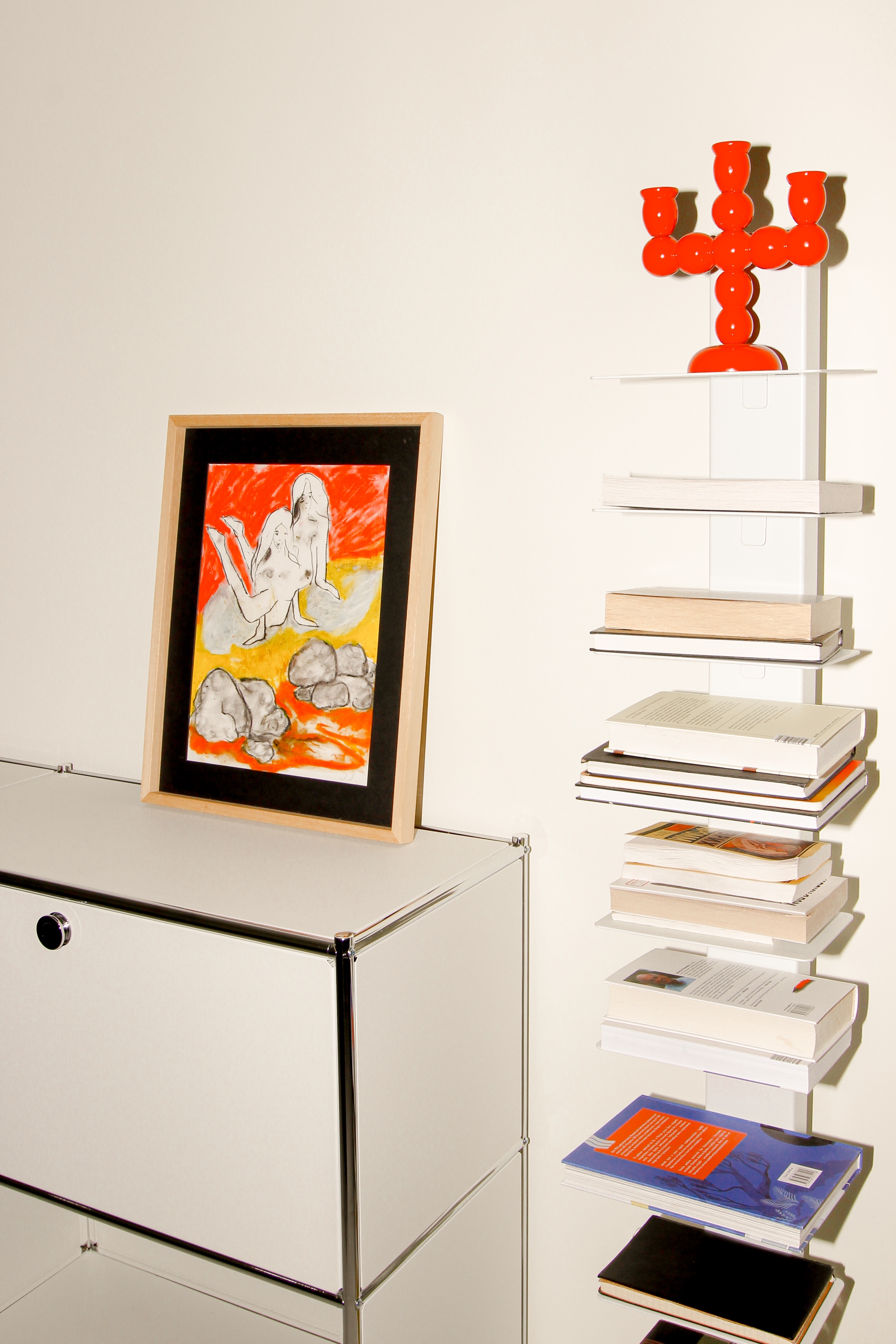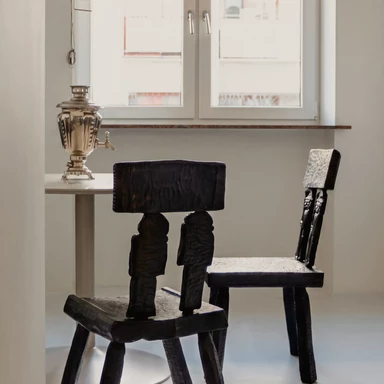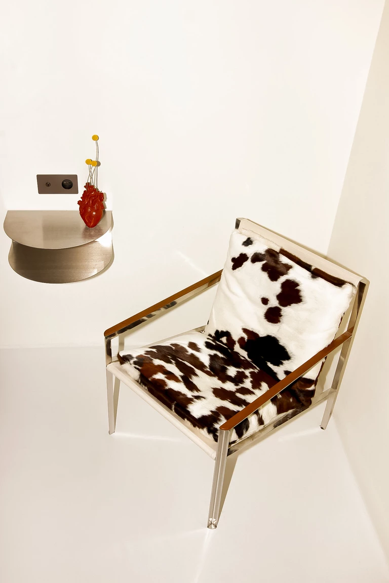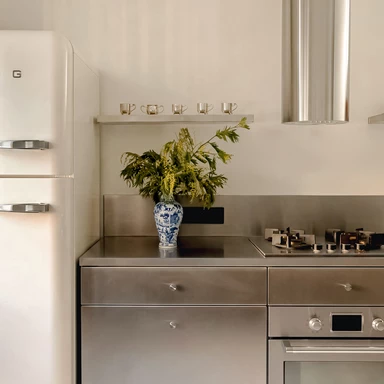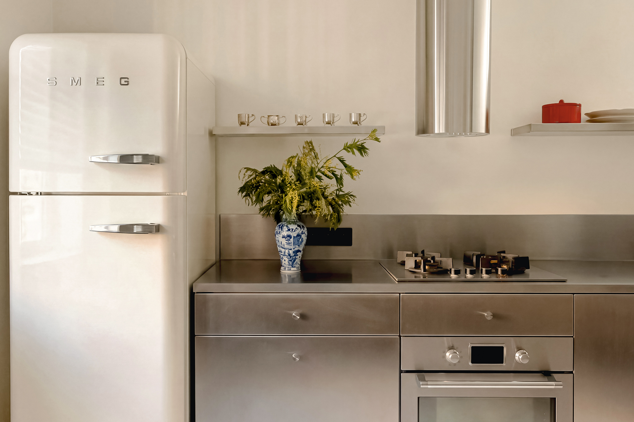 Dla równowagi stworzono neutralną bazę w kolorze skorupki jajka oraz gładkie, białe podłogi z mikrocementu, co zapewnia wnętrzu wizualny oddech. To zestawienie sprawia, że mimo niewielkiego metrażu i obecności wielu wyrazistych przedmiotów, mieszkanie wydaje się niespodziewanie przestronne i przewiewne. Nowoczesny, niemal surowy sznyt wprowadzają szklane biurko, stalowa kuchnia oraz fotel obity futrem, co pozwala uniknąć wrażenia przebywania w nostalgicznym muzeum.