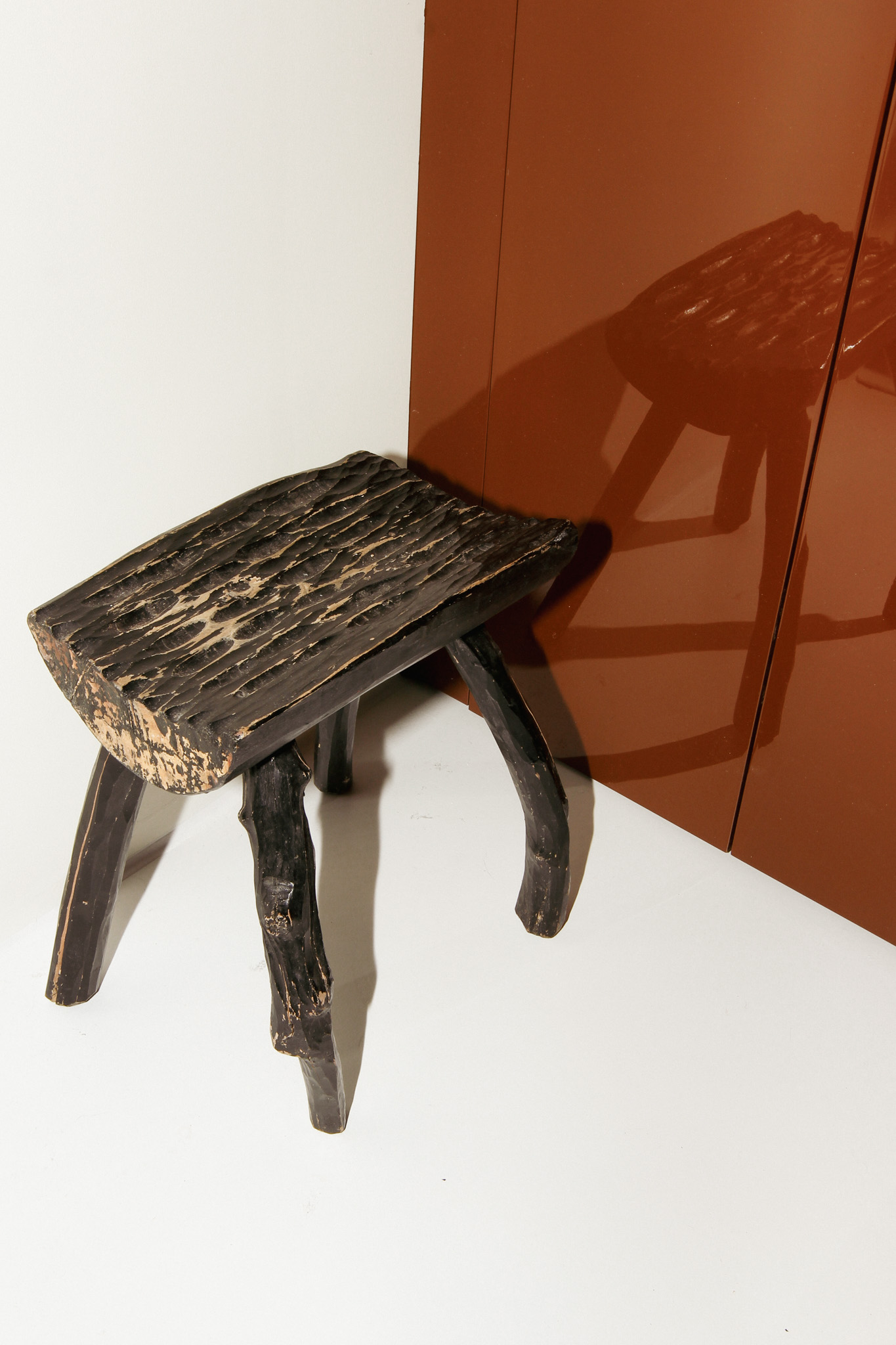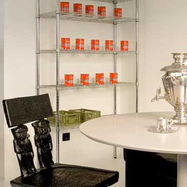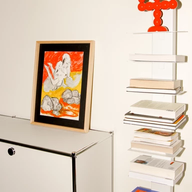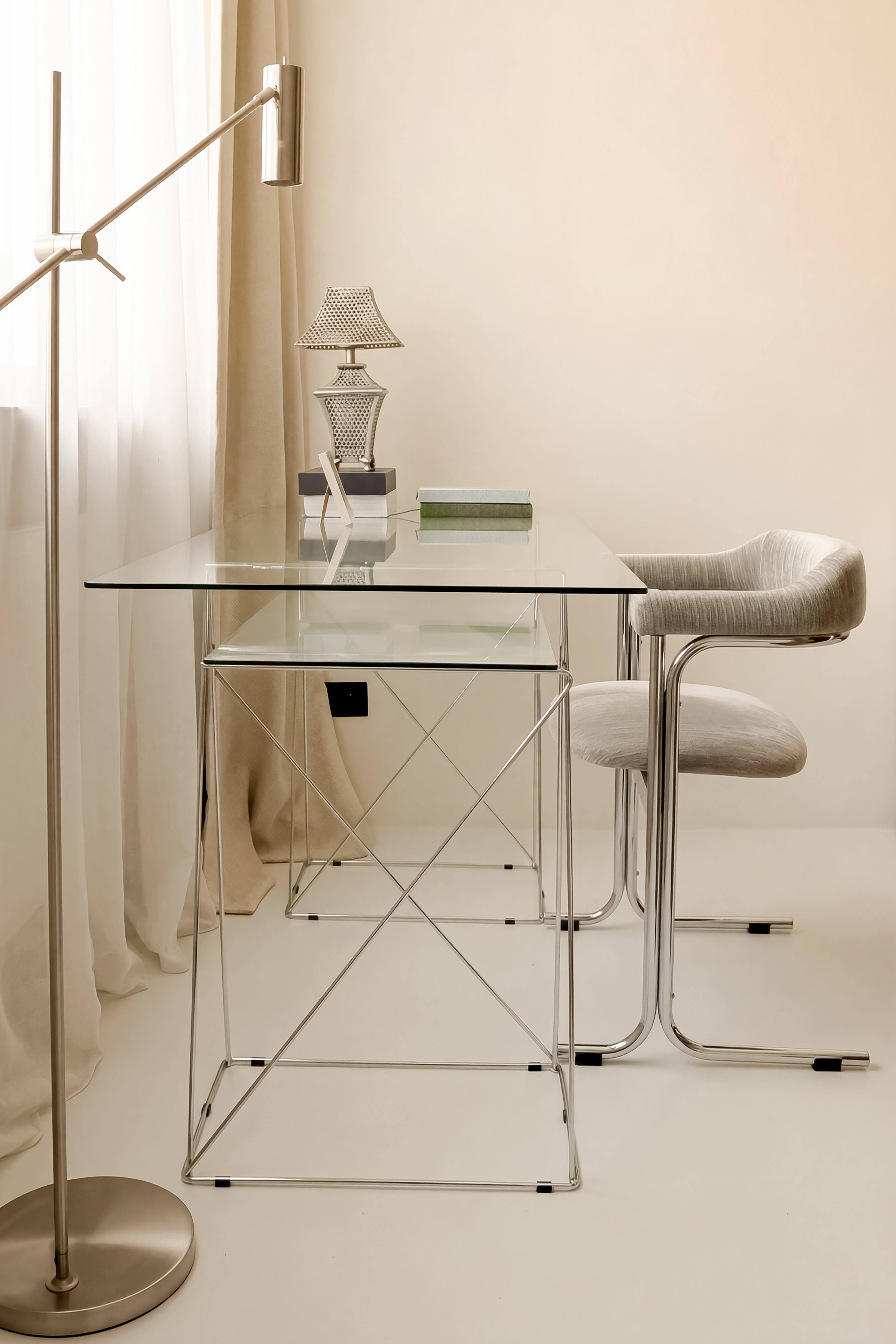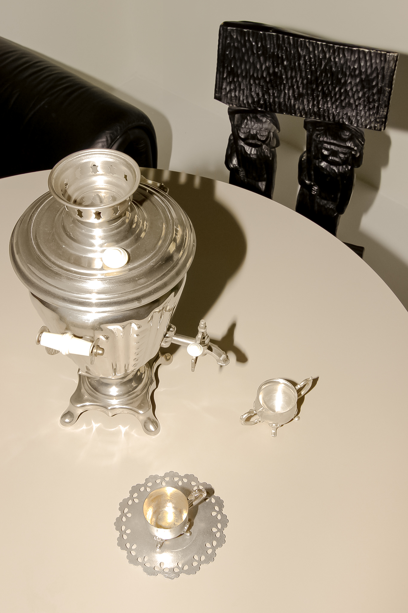 Dla równowagi stworzono neutralną bazę w kolorze skorupki jajka oraz gładkie, białe podłogi z mikrocementu, co zapewnia wnętrzu wizualny oddech. To zestawienie sprawia, że mimo niewielkiego metrażu i obecności wielu wyrazistych przedmiotów, mieszkanie wydaje się niespodziewanie przestronne i przewiewne. Nowoczesny, niemal surowy sznyt wprowadzają szklane biurko, stalowa kuchnia oraz fotel obity futrem, co pozwala uniknąć wrażenia przebywania w nostalgicznym muzeum.