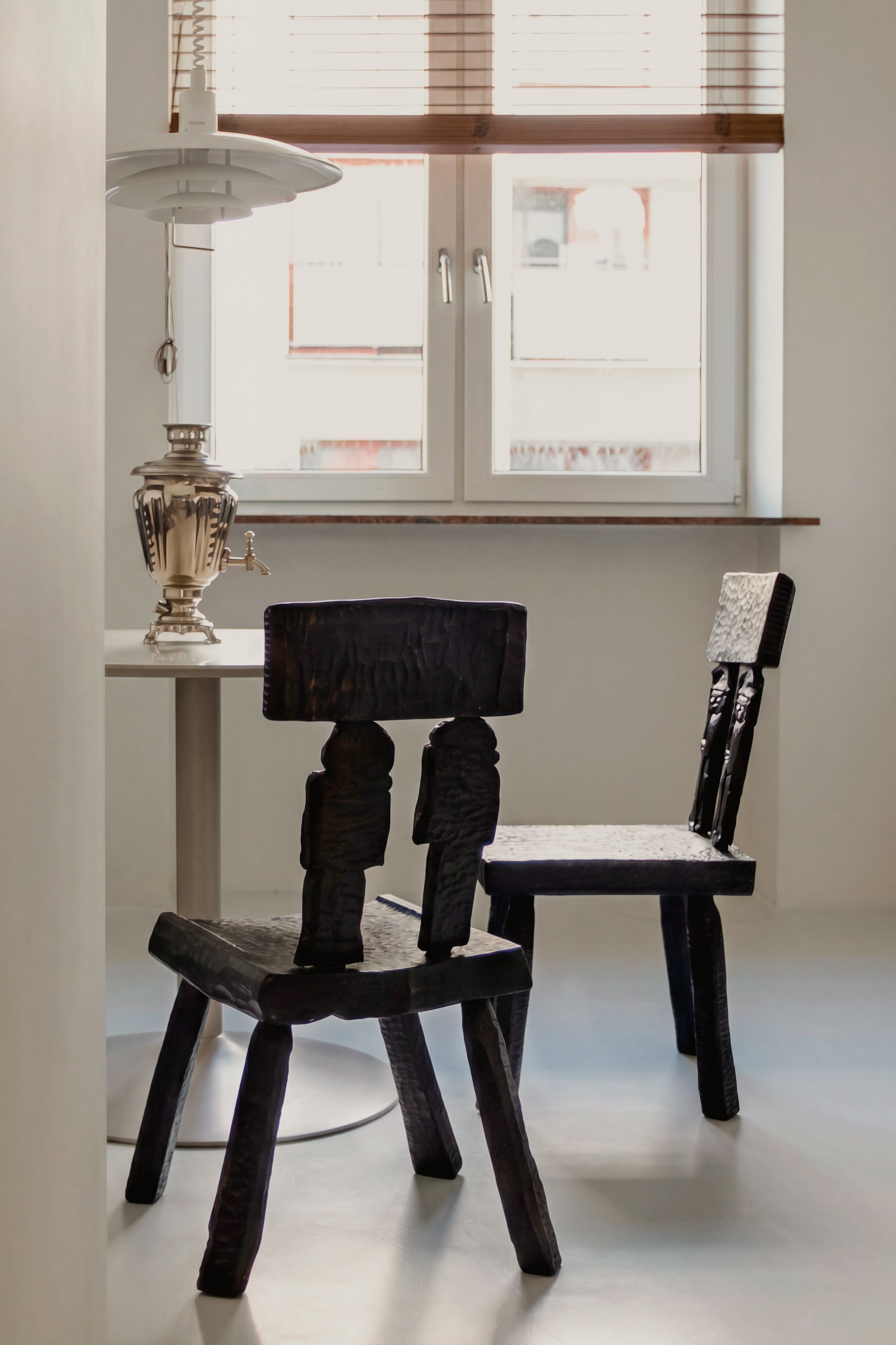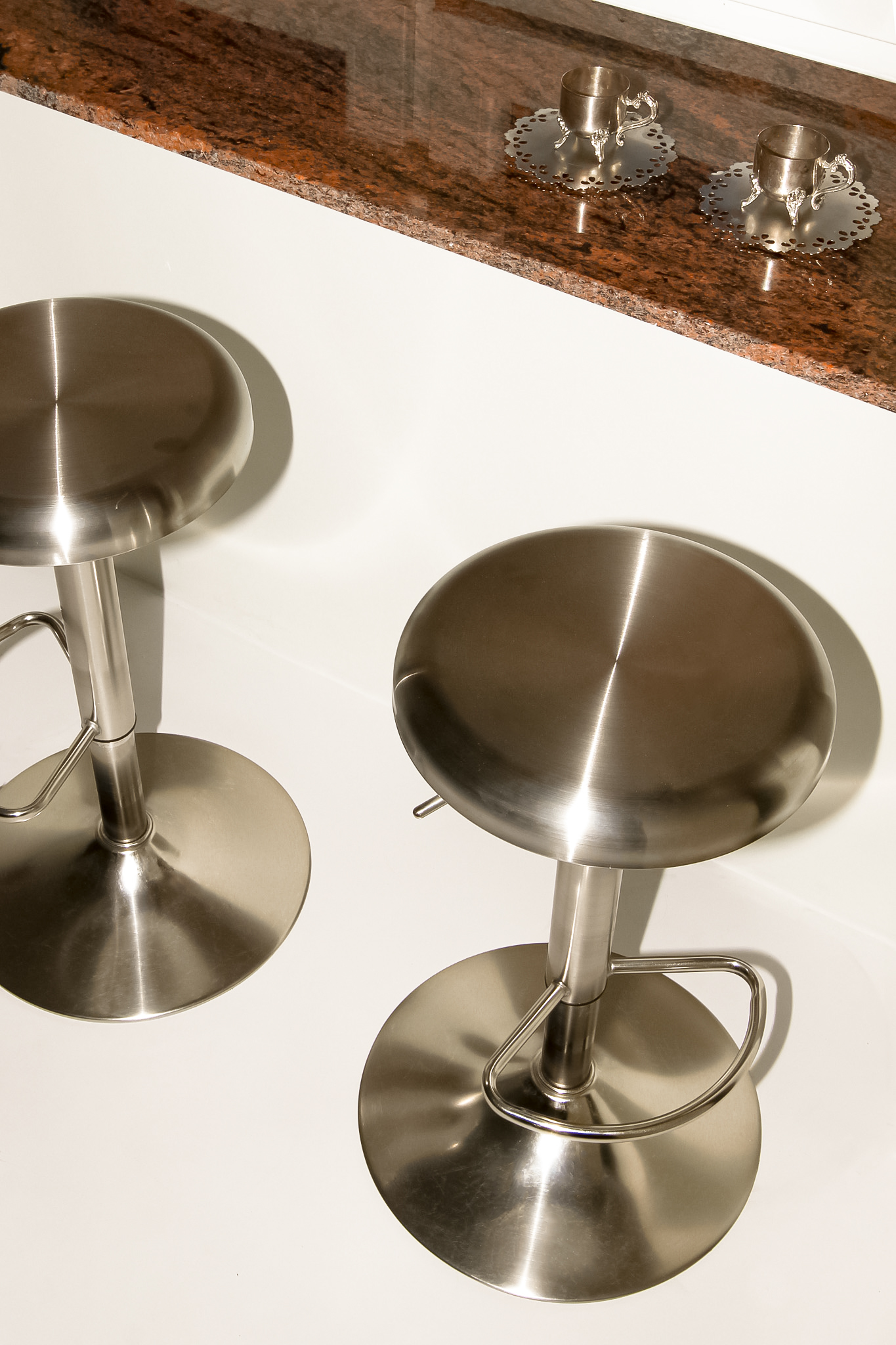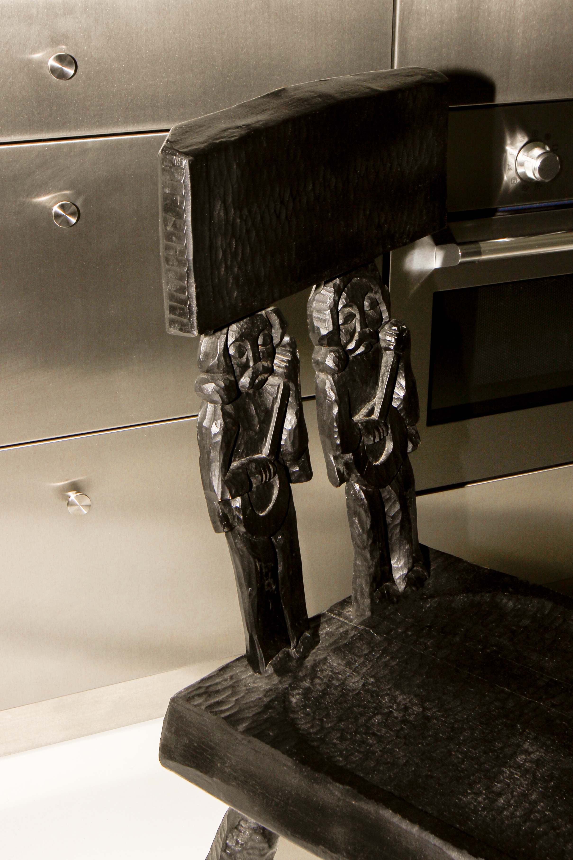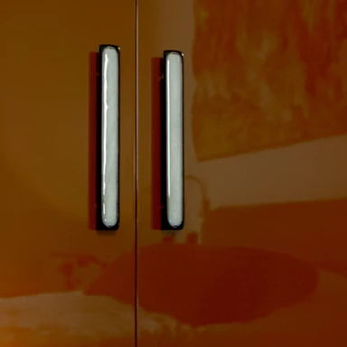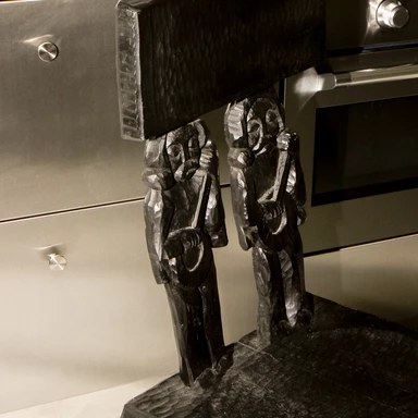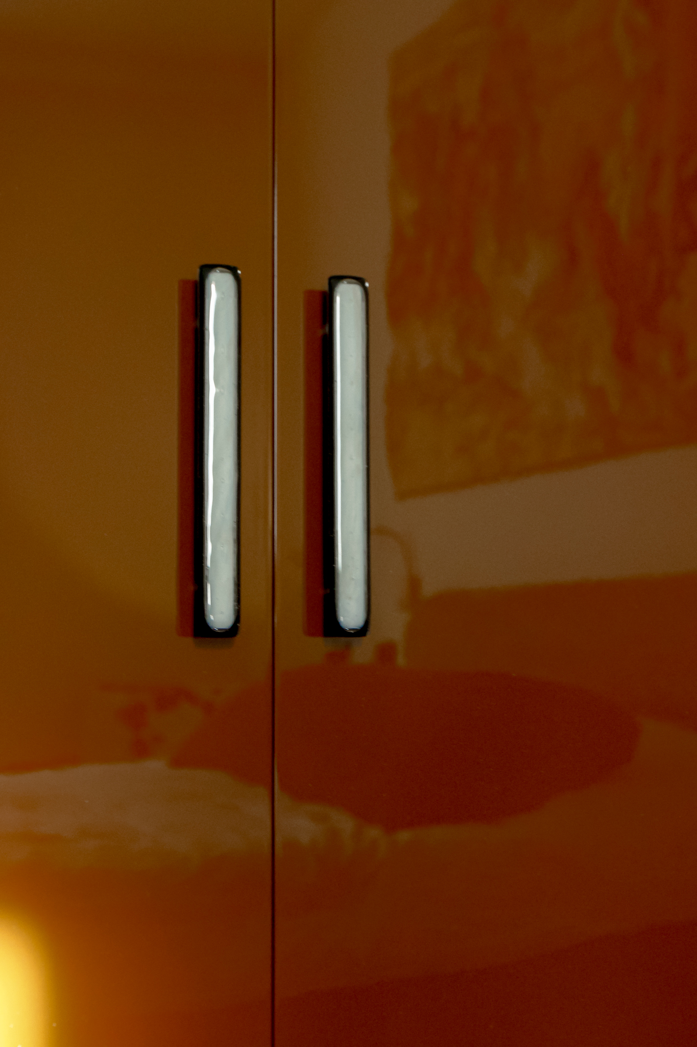 Wybór mebli i detali to świadomy dialog z historią polskiego designu. Zakopiańskie krzesła i skórzana kanapa vintage sąsiadują tu z nowoczesnymi elementami wykonanymi na zamówienie, które w abstrakcyjny sposób interpretują formy z przeszłości. Lśniące fronty szafek nawiązują do lakierowanych mebli z okresu PRL-u, owalne lustro w łazience przywołuje na myśl kształty dawnych toaletek, a uchwyty z kolorowego szkła stanowią ukłon w stronę bogatych tradycji polskiego szklarstwa.