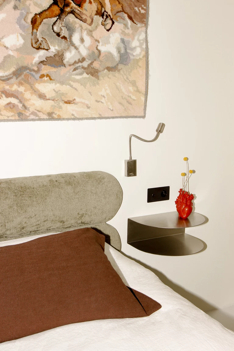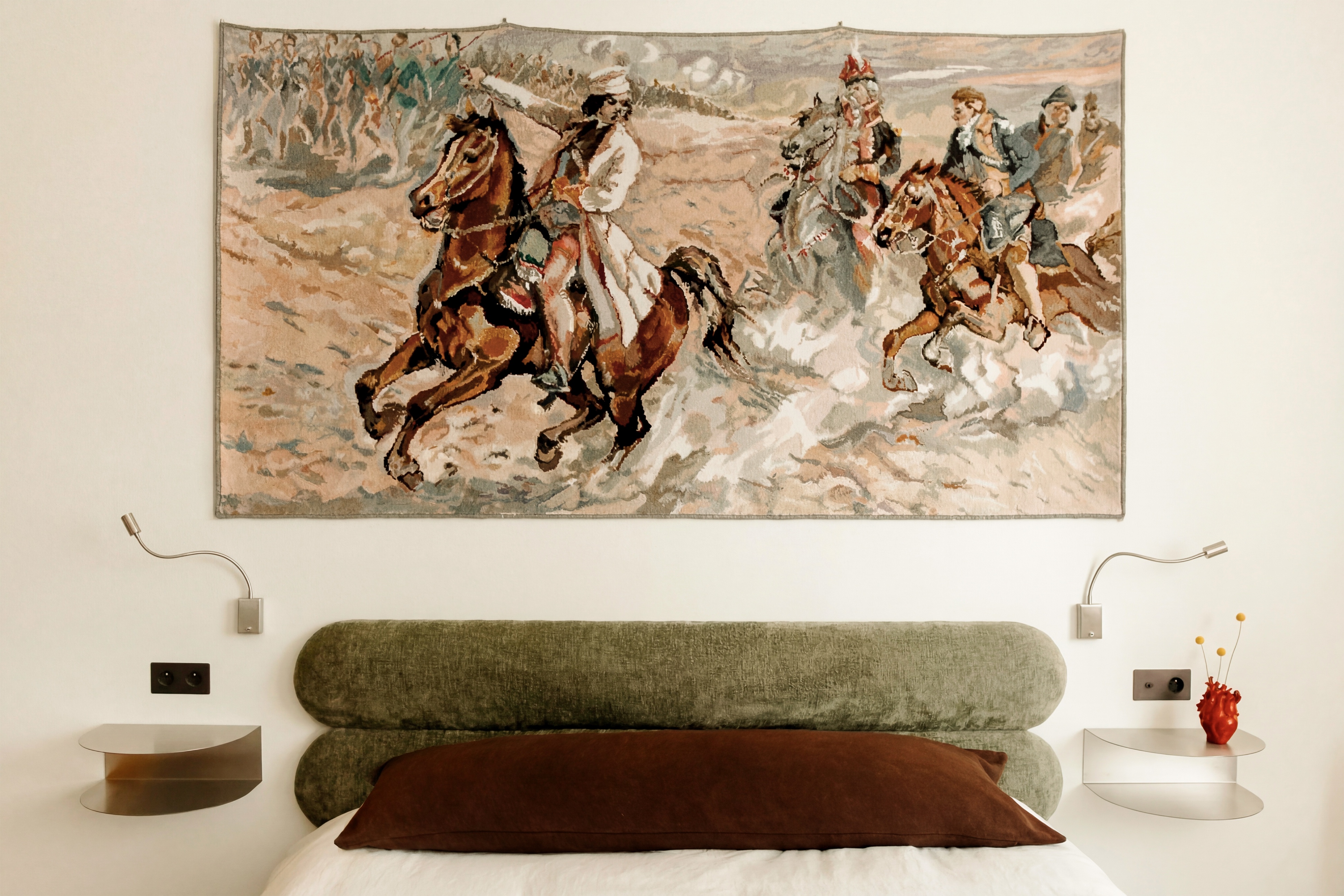 Centralnym punktem sypialni stał się babciny gobelin przedstawiający scenę z zapomnianej wojny, który teraz nadaje ton całej strefie wypoczynku, łącząc pokolenia swoją narracją.
