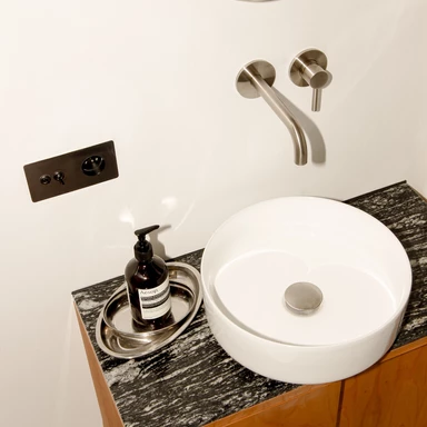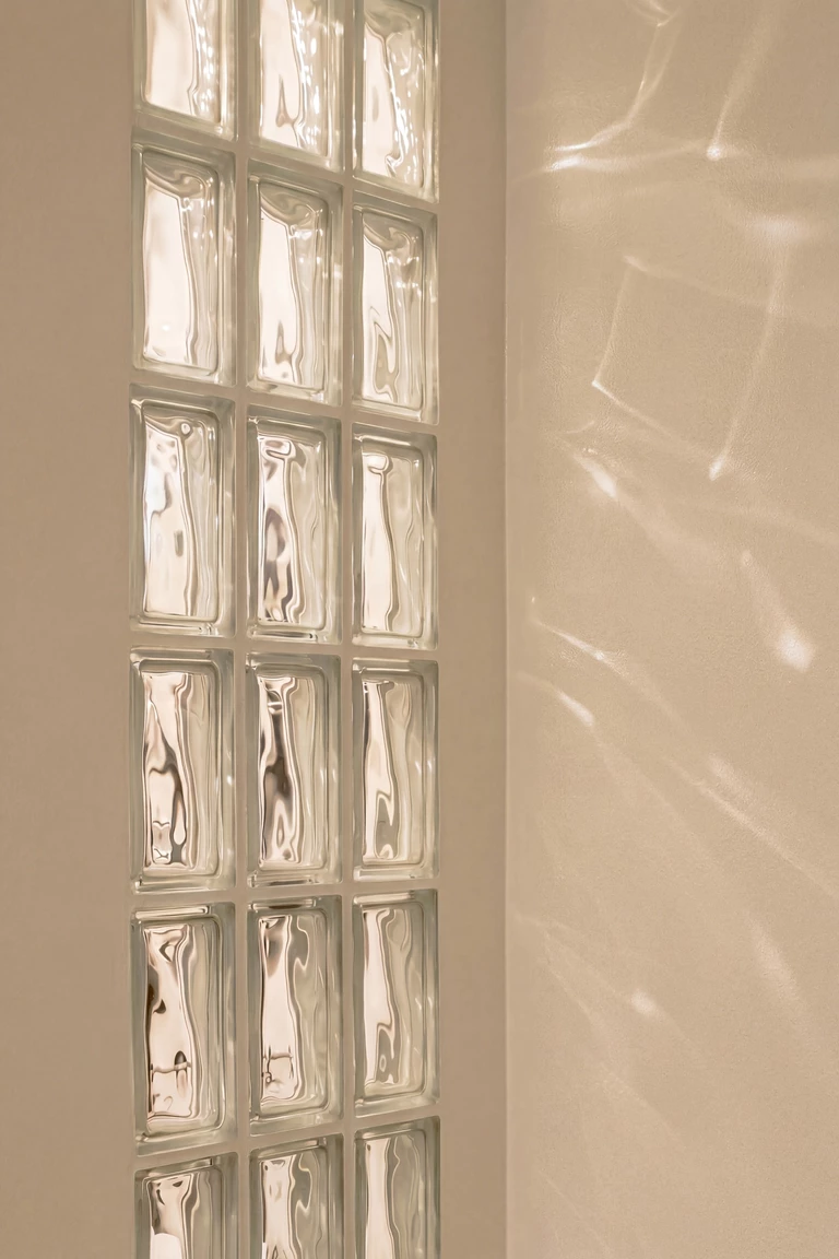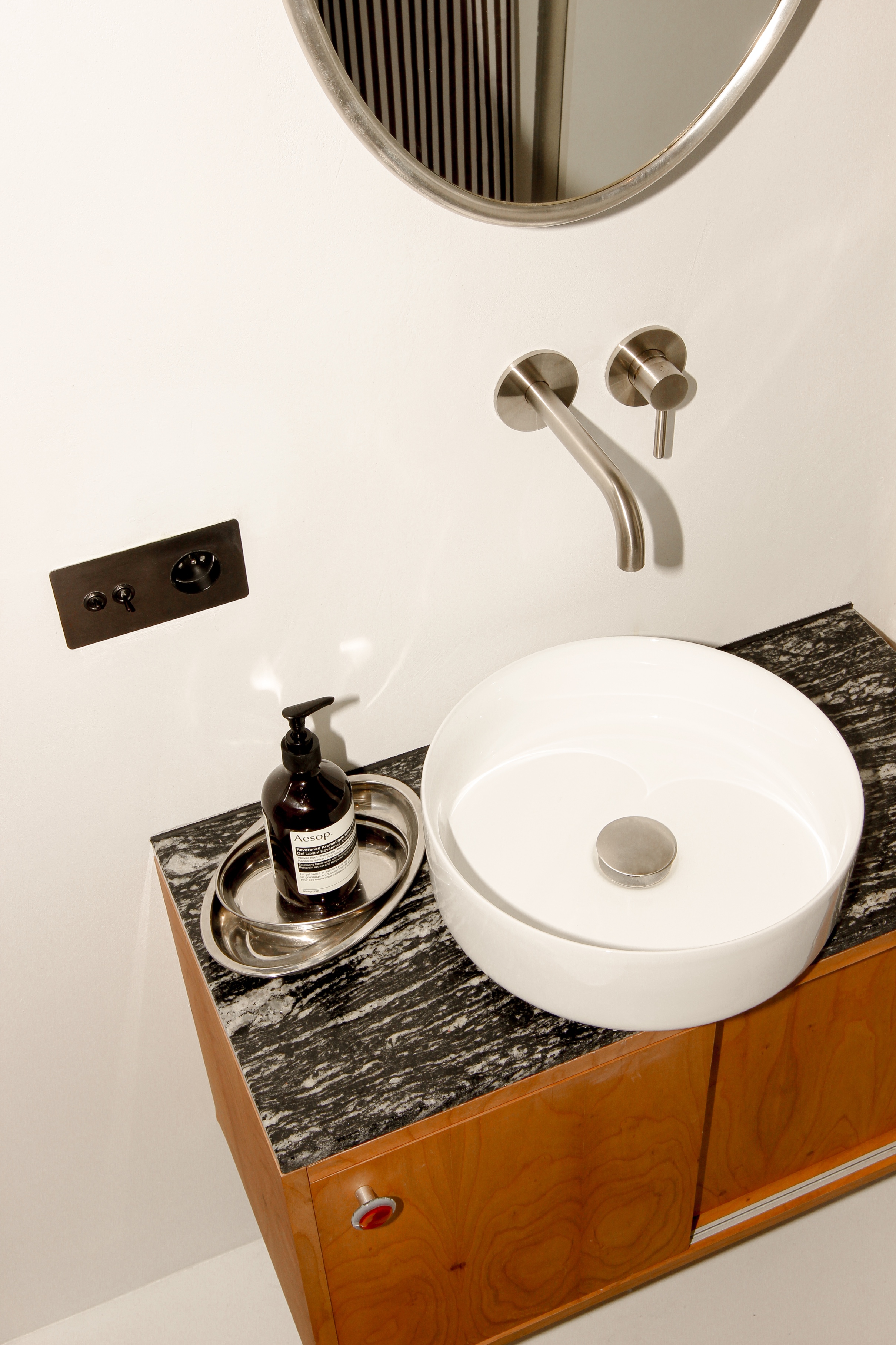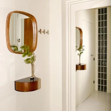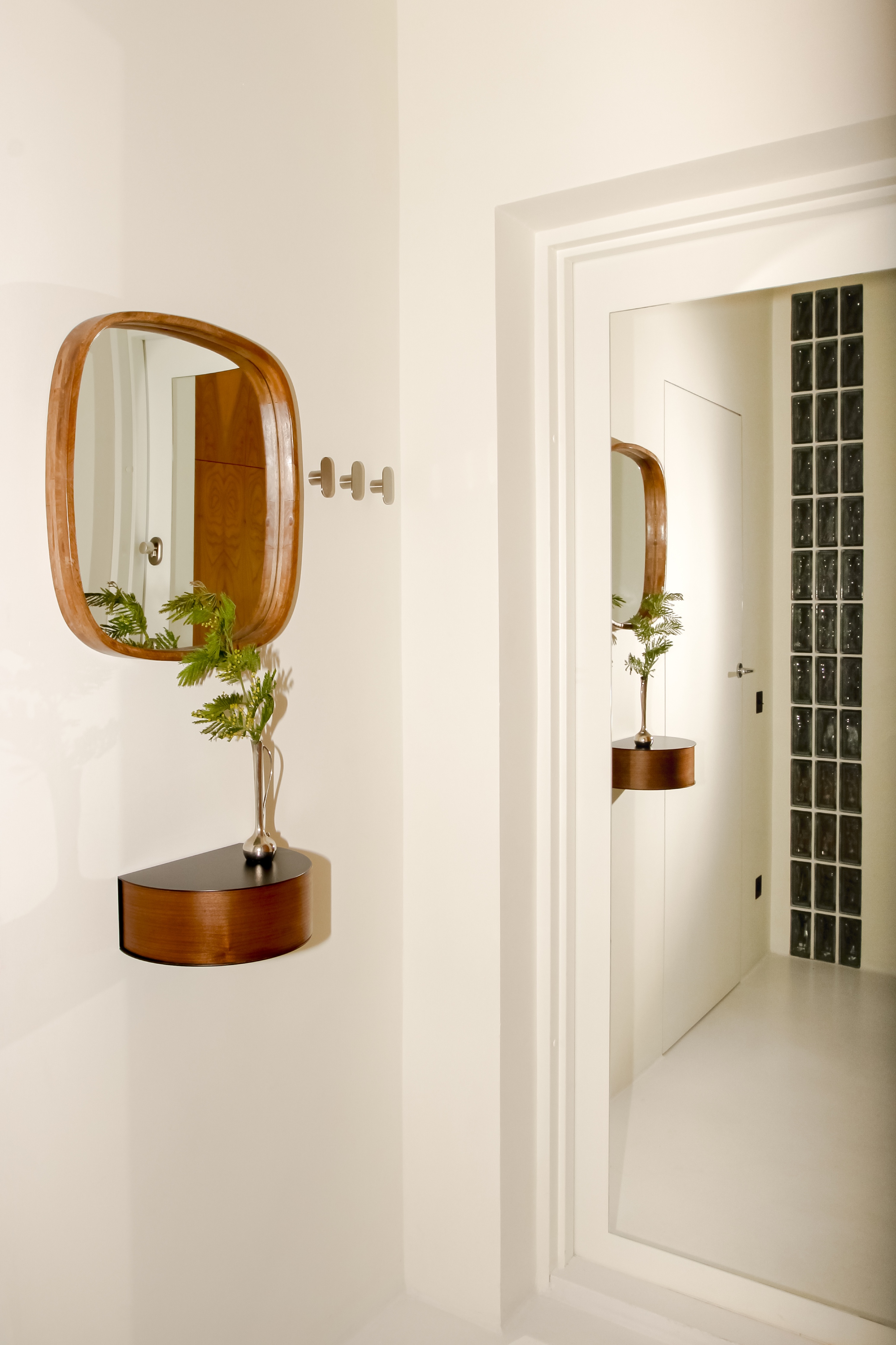 W tym samym tonie wybrzmiewa podejście do detali budowlanych, zachowanych i wyeksponowanych - tak jak np. oryginalne drzwiczki rewizyjne komina. W kontraście, pomiędzy przedpokojem a łazienką, pojawiły się nowe luksfery, które są czytelnym nawiązaniem do materiałów królujących w polskim budownictwie powojennym.