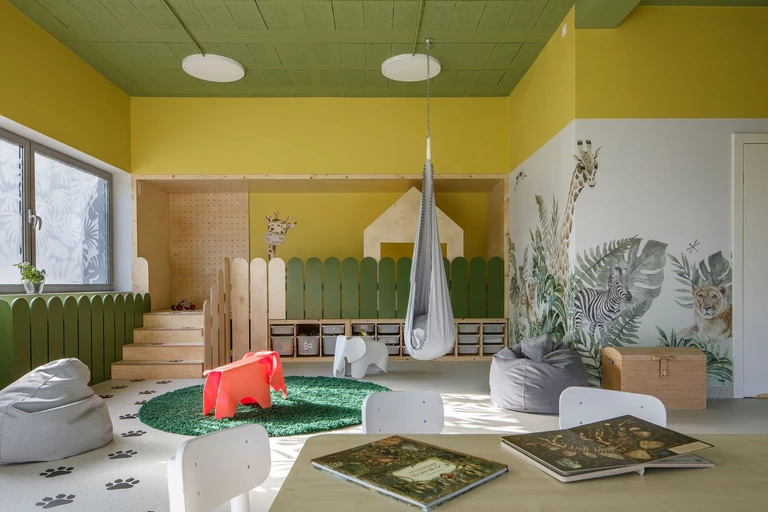 Wiele elementów wystroju wnętrz zachęca do zabawy – podesty, domki, podwieszane kokony, stworzone, by się zaszyć i pobujać, namioty, w których można przeżyć najazd sąsiedniego plemienia Indian. Jest też zabawkowa zabudowa kuchenna, przy której zmieszczą się wszystkie małe gosposie. Meble do przechowywania – półki oraz szafki na książki, pomoce naukowe i zabawki zaprojektowane zostały jako bezpieczne regały w drewnianej zabudowie.