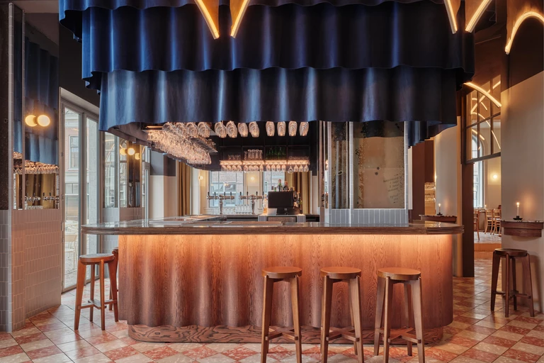Zabudowa baru przypomina zasłonę - fale imitujące tkaninę zostały wyrzeźbione w drewnie. Sęki dębu biegną w dwóch kierunkach, tworząc efektowny kontrast: pionowo na blacie, poziomo na podstawie. Nawiązując do klasycznej brasserie, górną część baru wykonano z cynku. Kolumny w narożnikach zostały wyłożone zaś jasnoniebieskimi płytkami i ręcznie postarzanym lustrem, zaprojektowanymi tak, aby dokładnie pasowały do kolorystyki miasta. Nawiązaniem do sztuk performatywnych są stopki kieliszków do wina, które wystają spod zasłony i wyglądają niczym tutu.