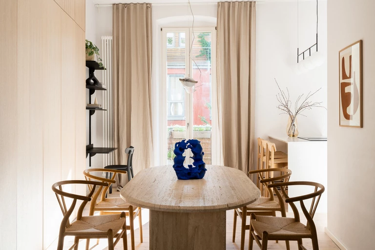 W części jadalnianej uwagę zwraca trawertynowy stół, który architektka złożyła z dwóch mebli – blat jest z jednego stołu, a nogi z innego. „Od początku chciałam wprowadzić do wnętrza element vintage, bo to rozwiązanie dobrze komponuje się we wnętrzach kamienic i wprowadza dozę ponadczasowości” - wyjaśnia Agnieszka Kuczyńska.