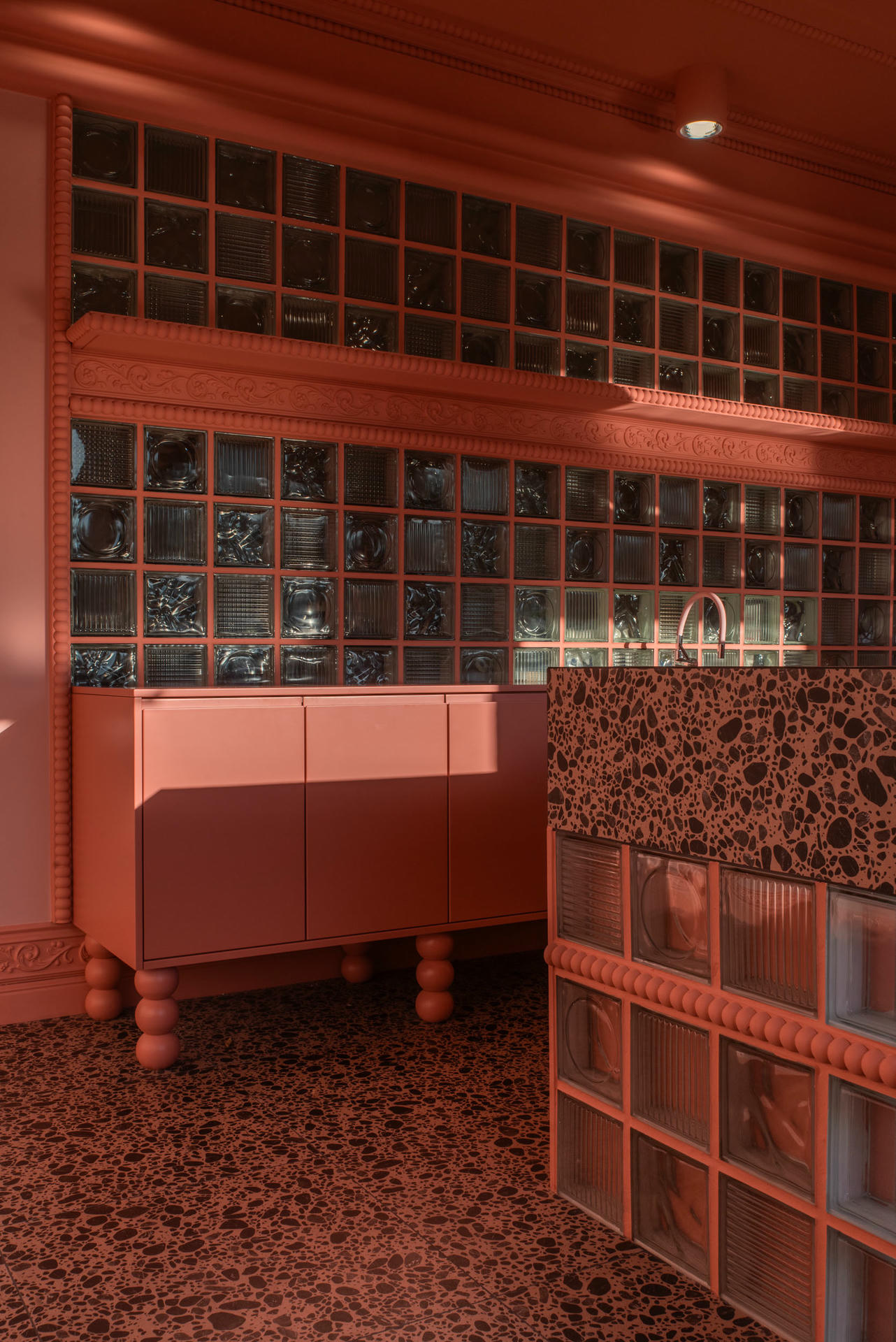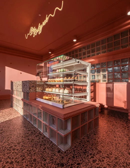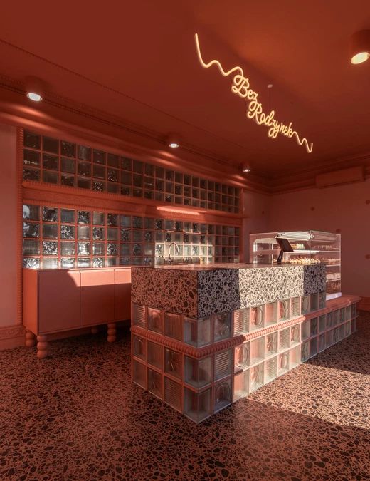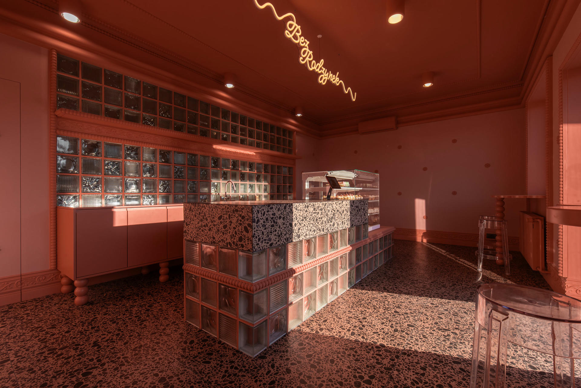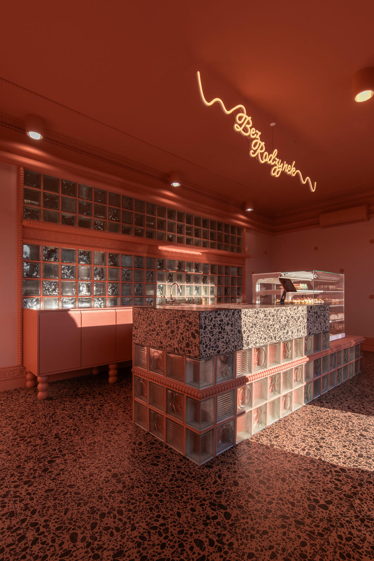Najważniejszym elementem tej przestrzeni stał się długi kontuar z witryną na wypieki, ustawiony w osi wejścia. Jego podstawa została wykonana z pustaków szklanych o zróżnicowanych fakturach, które w świetle dziennym łapią refleksy, zniekształcają obraz i nawiązują do wyglądu galaretki.