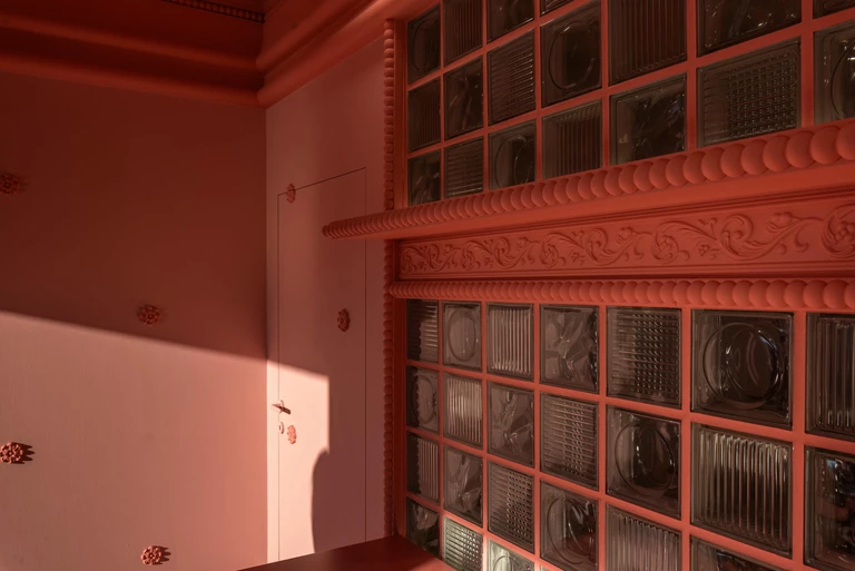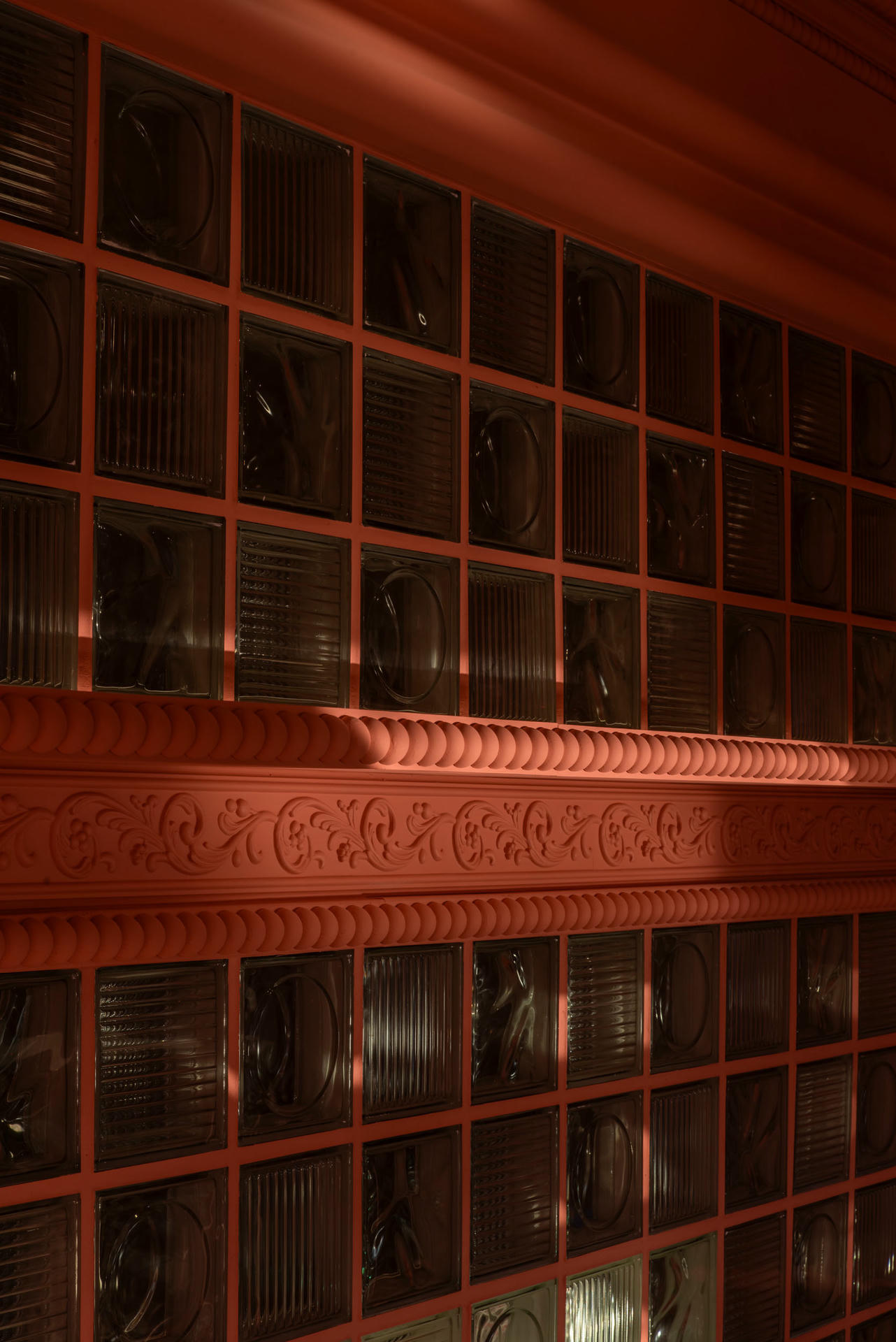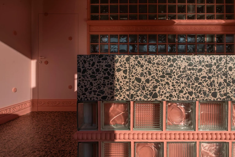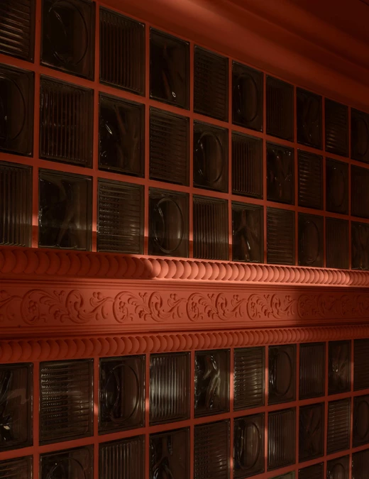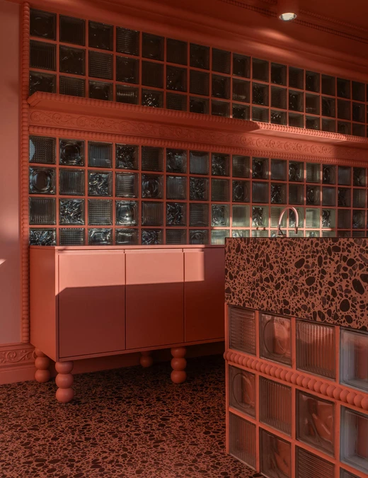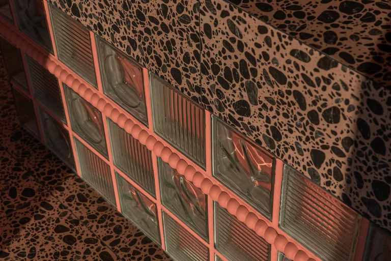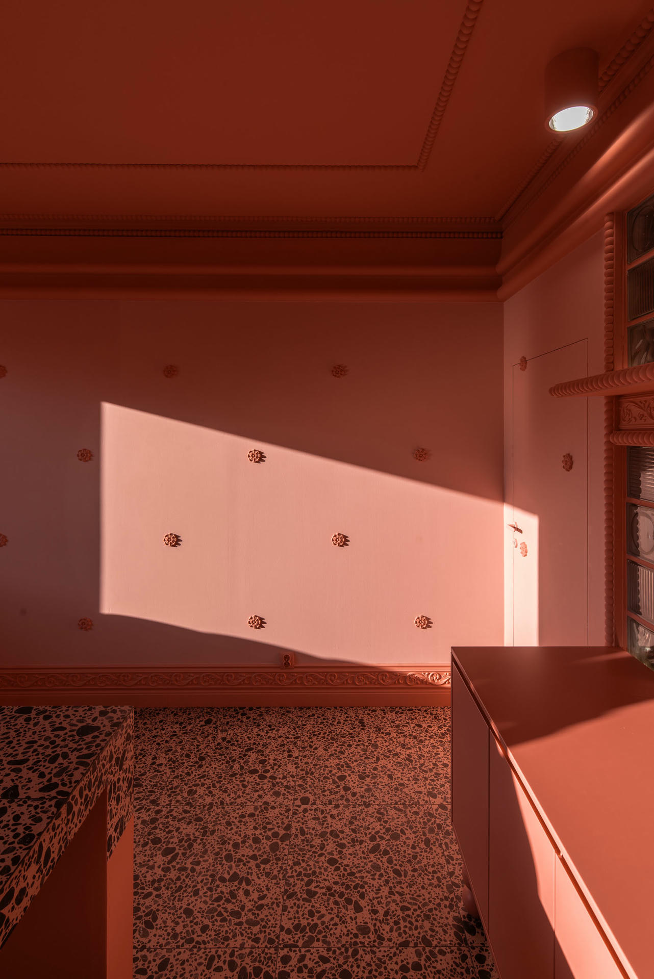 Najważniejszym elementem tej przestrzeni stał się długi kontuar z witryną na wypieki, ustawiony w osi wejścia. Jego podstawa została wykonana z pustaków szklanych o zróżnicowanych fakturach, które w świetle dziennym łapią refleksy, zniekształcają obraz i nawiązują do wyglądu galaretki.