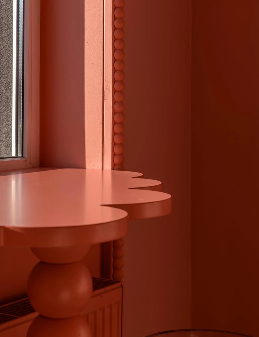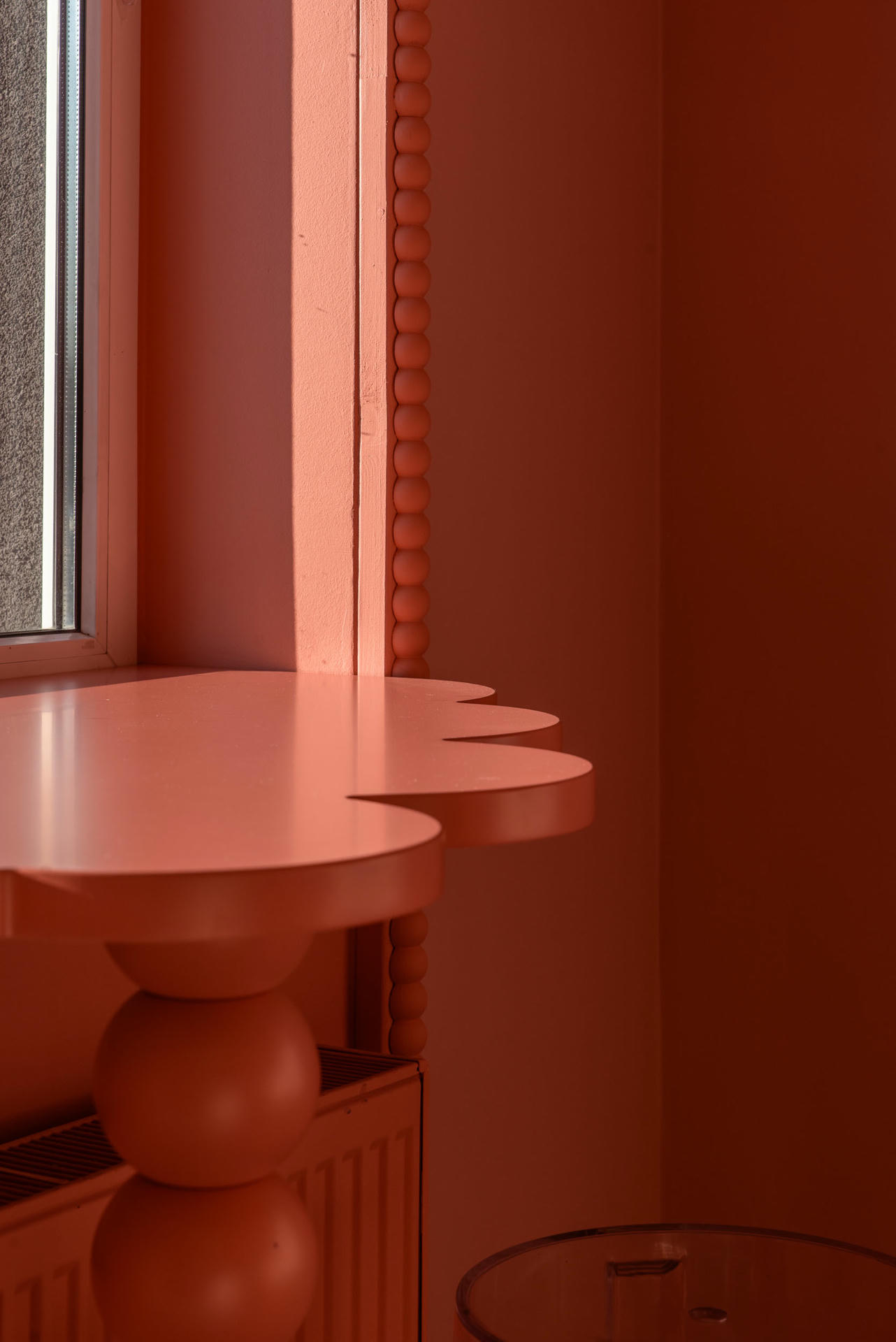 Cukiernicze inspiracje można dostrzec także w detalach. „Perełkowe” gzymsy obiegają ściany i sufit niby dekoracyjna obwódka tortu. Nogi mebli przybrały formę kulistych, rytmicznie ustawionych elementów, a blaty stolików przy oknach mają delikatnie falujące krawędzie.