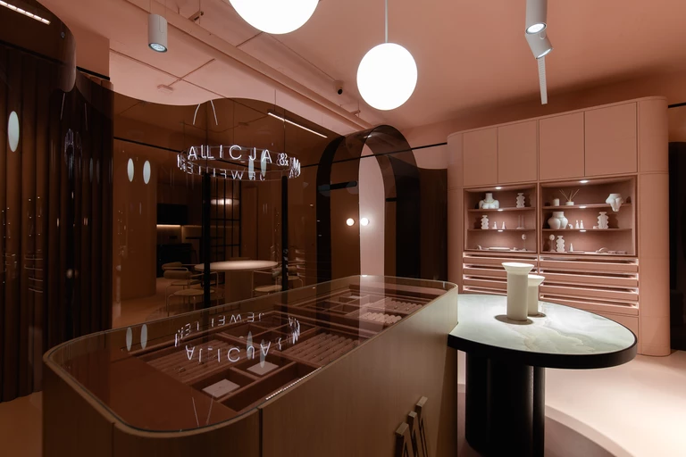 Podobne podejście do kreowania wnętrza lokalu towarzyszy właścicielce Alicja&Maria Jewellery. Z tego względu głównym założeniem projektu było nawiązanie do produktów oferowanych przez markę, czyli srebrnej i złotej biżuterii o niebanalnych wzorach, oraz brandingu, który opiera się na prostych formach i jasnym odcieni różu. Ponadto przestrzeń miała stanowić połączenie butiku, biura oraz pracowni.