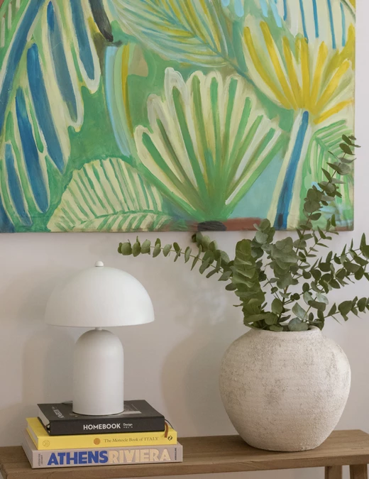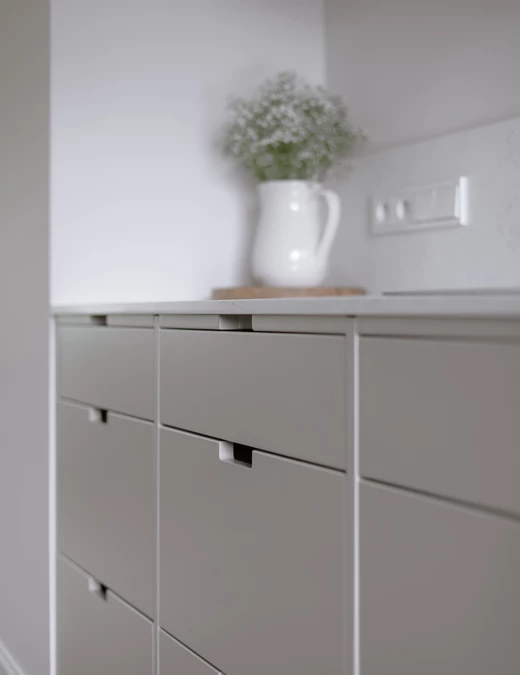 Na parterze domu znajduje się strefa dzienna z kuchnią otwartą na salon i jadalnię oraz toaletą. Zabudowę kuchenną utrzymano w jasnym odcieniu taupe i połączono z białym blatem ze spieku, którym wykończono też fragment ściany nad obszarem roboczym. W części jadalnianej uwagę zwracają lampy "Flamingo" marki Vibia wiszące nad stołem. Wokół stołu stanął zaś komplet drewnianych krzeseł z plecionym siedziskiem nawiązujący do skandynawskiej klasyki.