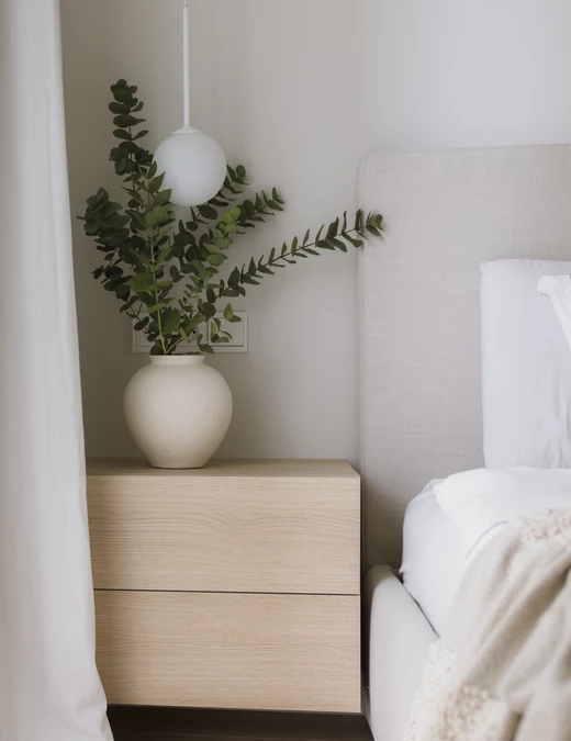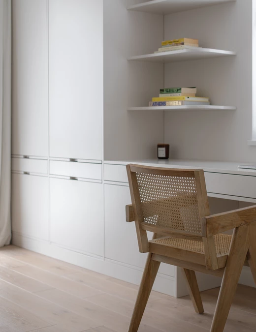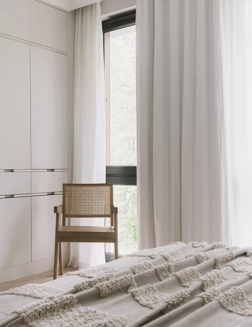 Odstępstwa od tej stylistyki nie ma nawet w pokoju dziecięcym. Tam również architektka zabudowała jedną ze ścian praktyczną i pojemną szafą. Jedynym dekoracyjnym detalem w tym jasnym wnętrzu jest tapeta z lotniczym motywem.