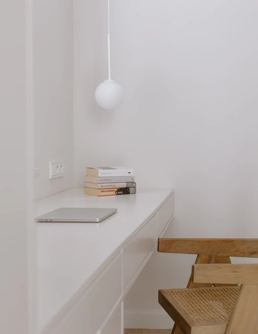 W domowym gabinecie biurko do pracy wkomponowano w zabudowę meblową, dzięki której właściciele domu zyskali dodatkowe miejsce do przechowywania. Zamiast zwykłej lampki biurkowej jest wiszący nad blatem szklany klosz.