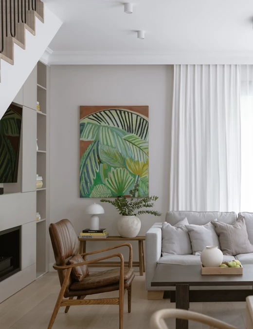 W salonie architektka sprytnie wykorzystała przestrzeń pod schodami – zaaranżowała tam miejsce na kącik RTV, szafki, niewielki regał oraz kominek. Ta część strefy dziennej została utrzymana w kolorystyce charakterystycznej dla całego domu – to połączenie bieli, beżu i szarości. Tę kompozycję barw przełamują dodatki, takie jak obraz, skórzany fotel czy balustrada schodowa.