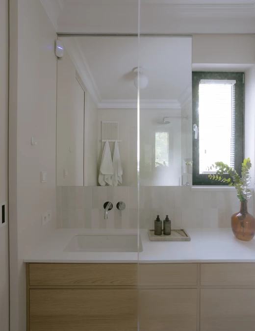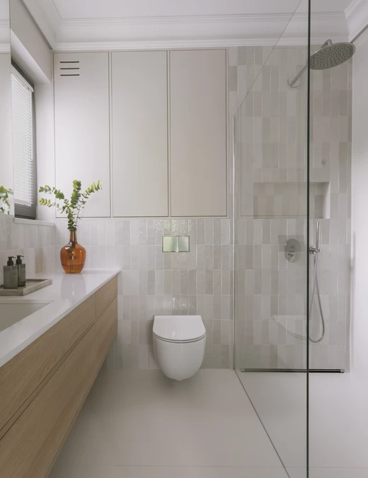 Biel w jednej z łazienek na piętrze obecna jest na spieku kwarcowym z dużym, szarym żyłkowaniem, mozaice, którą pokryto jedną ze ścian oraz jasnej szafce umywalkowej i prostych płytkach podłogowych. Ten zestaw ociepla zabudowa nad sedesem w jasnym odcieniu drewna.