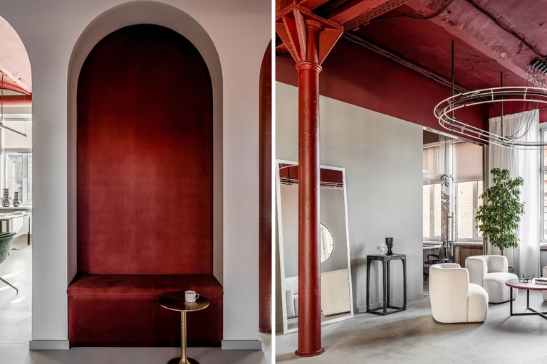 Wcześniej znajdowały się tu drukarnie. „Przeglądając archiwalne zdjęcia z tamtych lat, widzimy te same żeliwne kolumny, które wciąż dzielą przestrzeń roboczą pracowni. Cieszy nas to, bo związek z architekturą przeszłości ma dla nas szczególną wartość” – opowiada założycielka studia, Anastasia Bondarenko. Do kolumn postanowiono dodać łukowe portale i wgłębienia w ścianach, nawiązując tym samym do stylu „Memphis” oraz starożytnej klasyki.