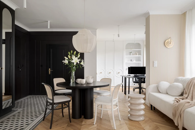 Charakterystyczny dla tego projektu jest mocny kontrast – połączenie głębokiej czerni z subtelnymi odcieniami kremu i bieli, które dodaje przestrzeni dynamiki. Natomiast dominujące obłe formy nadają wnętrzu płynność.