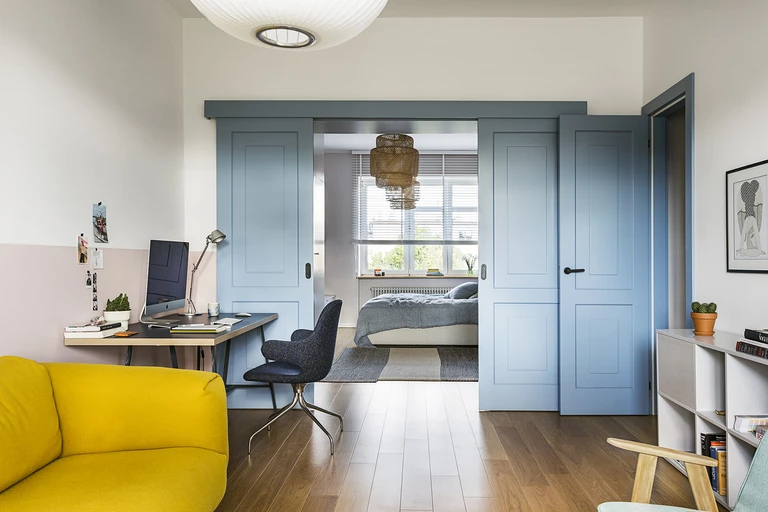 Wszystkie otwory drzwiowe zostały powiększone, żeby podkreślić wysokość mieszkania, a duże drzwi między sypialnią, a salonem zostały zmienione na przesuwne. Trzeba przyznać, że stolarka w błękitnym kolorze wygląda zachwycająco!
