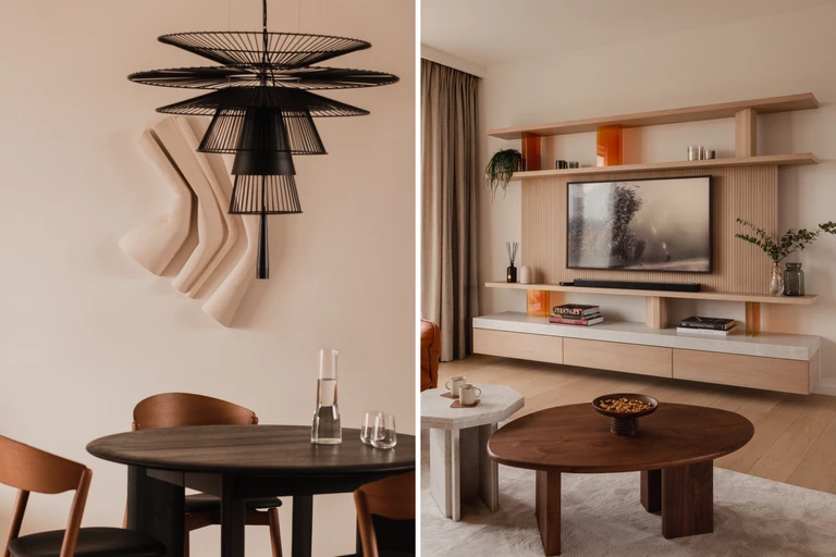 Bazowe materiały zanurzono w delikatnych tonacjach kolorów piaskowych i złamanych bieli, które wyróżniają się mocnymi fakturami. Bielone drewno dębowe na podłodze, fakturowy tynk na ścianach, biały kwarcyt i piaskowe ceramiczne mozaiki tworzą atmosferę spokoju. Ta delikatna paleta została przełamana akcentami z drewna orzechowego w kuchni i garderobie. Sercem mieszkania jest podkreślony czarnym kolorem stół jadalniany.