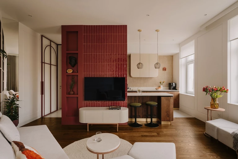 Wchodząc do kuchni, pierwsze, co widzimy, to wolnostojący komin pokryty połyskującymi płytkami ceramicznymi o nierównej płaszczyźnie w intensywnym kolorze ciemnej czerwieni. Tuż obok znajduje się kuchenny pion meblowy w bordowym kolorze, dzielący strefy na część kuchenną i część dzienną.