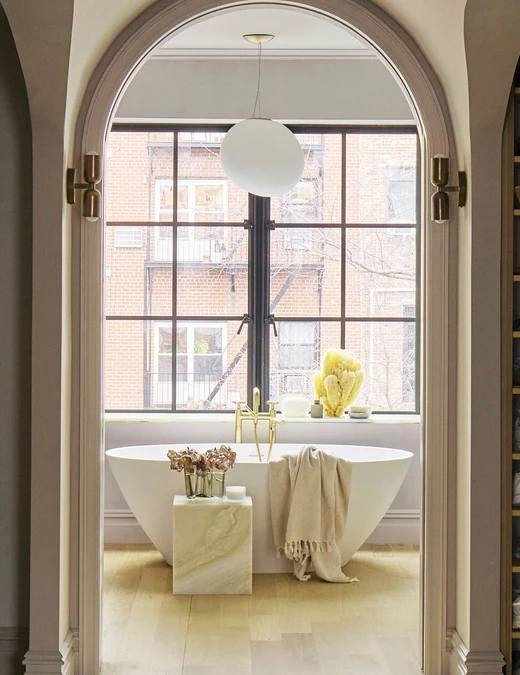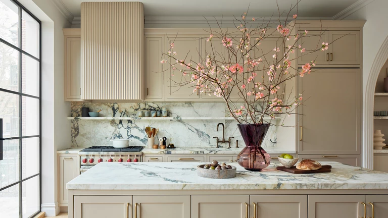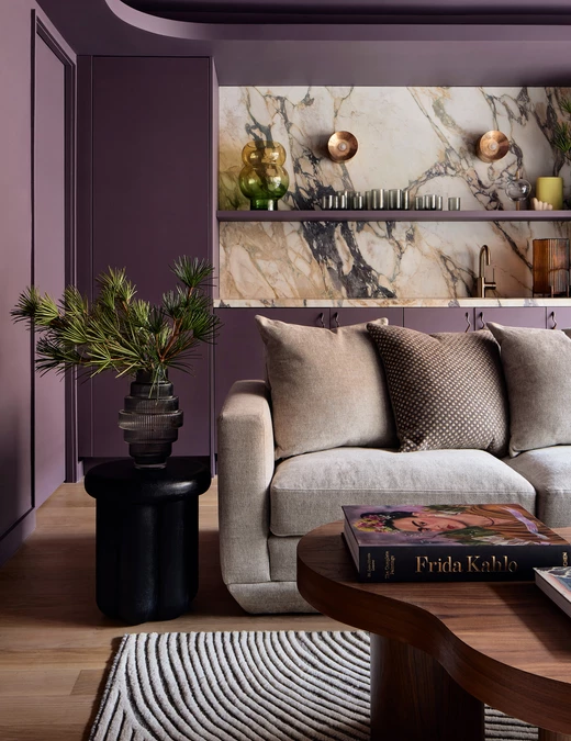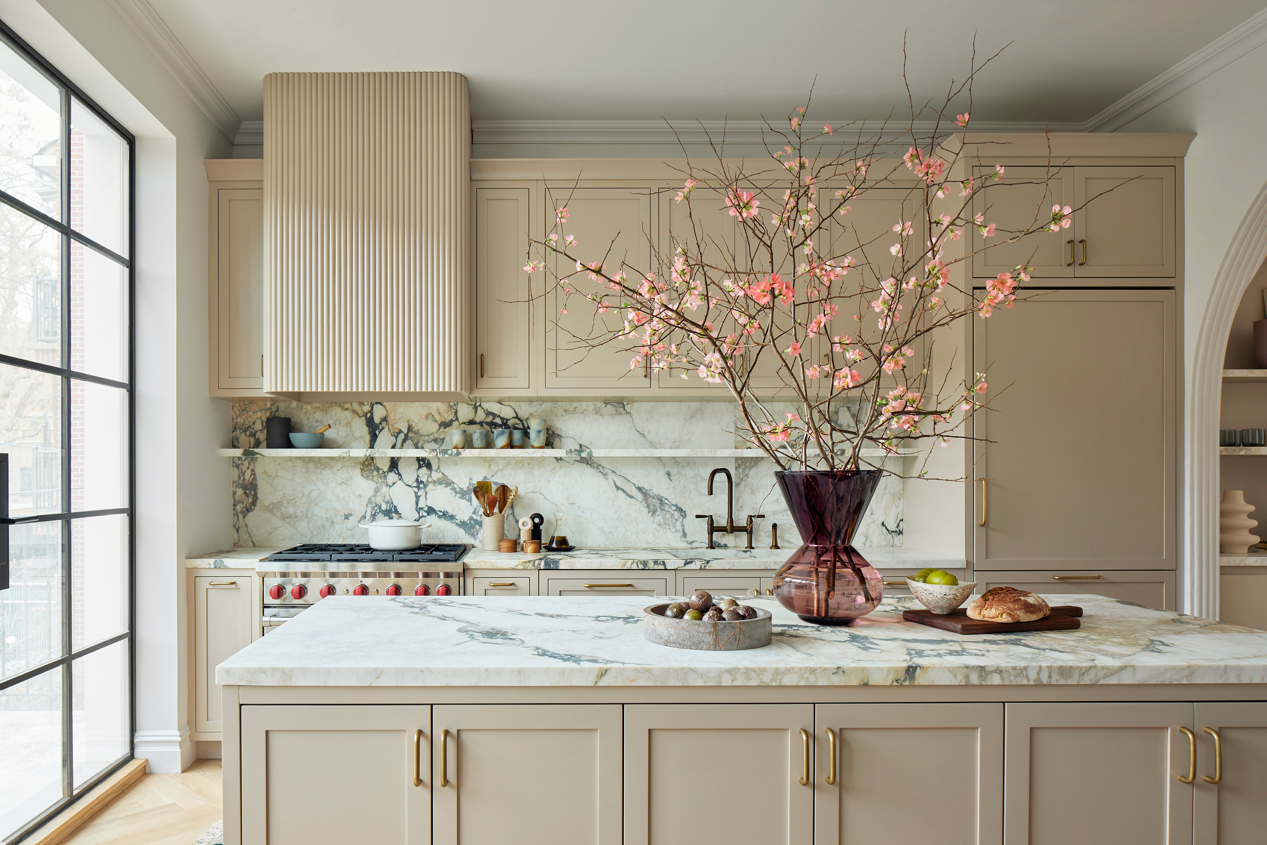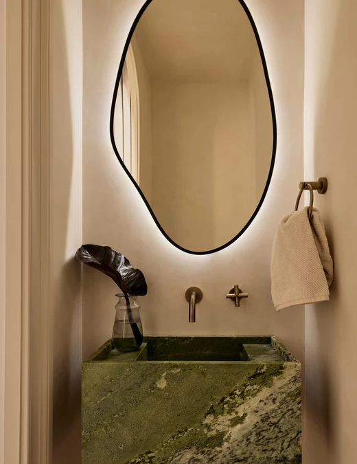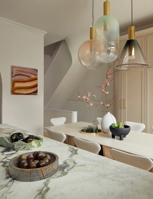 W kuchni, blaty i wyspę o szafkach w grzybowym odcieniu wieńczy marmur Calacatta Vagli Viola. W toalecie na parterze, otulonej kremowym tynkiem, główną rolę gra wykonana na zamówienie umywalka z irlandzkiego marmuru Connemara