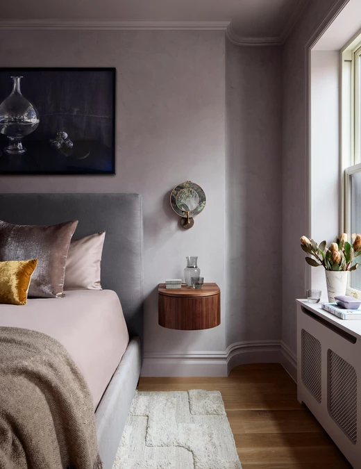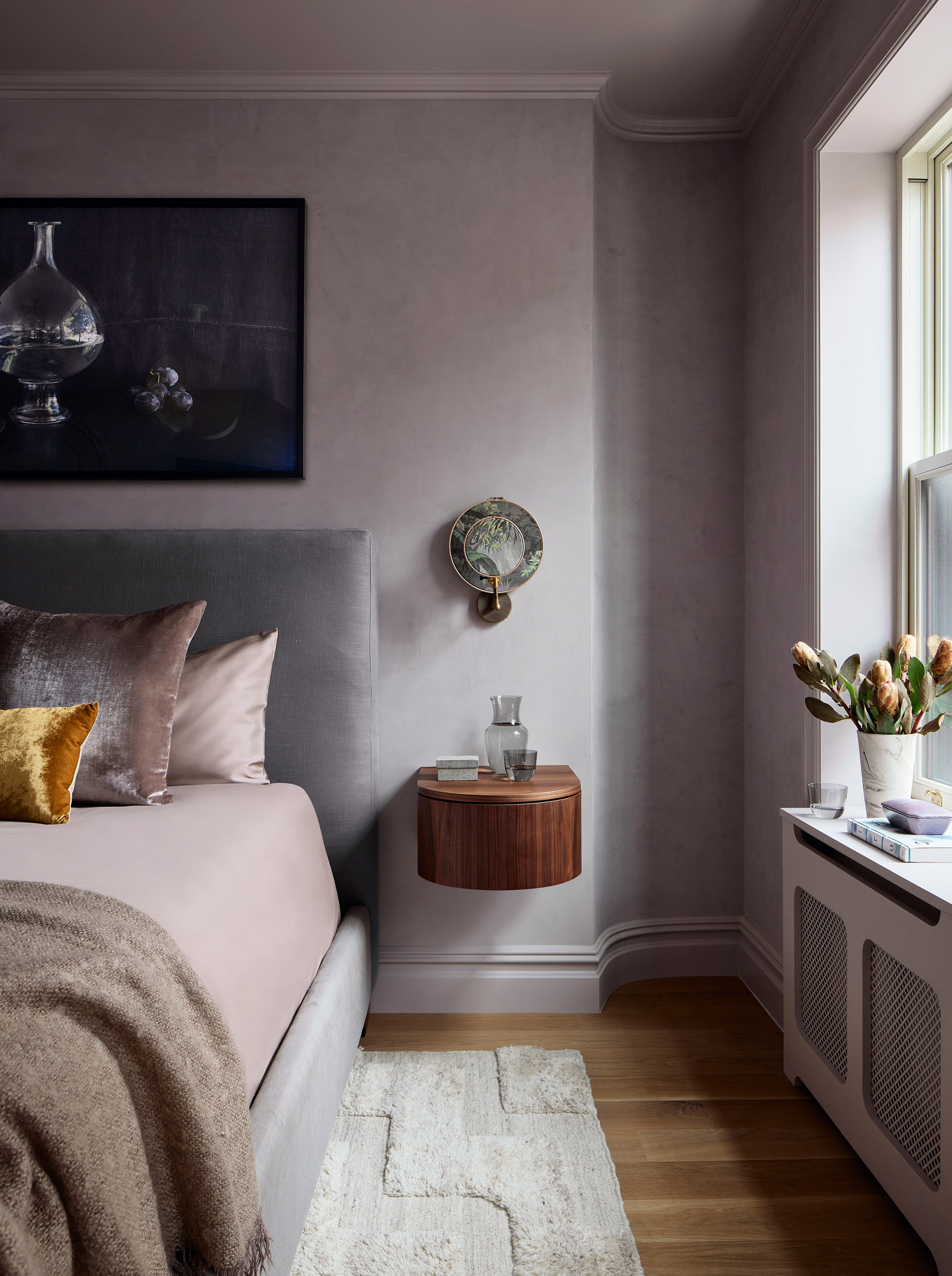 Na piętrze, w głównej sypialni, panuje spokojniejszy nastrój, budowany przez miękki, lawendowo-szary tynk i bejcowane elementy dębowe. Domowe biuro, dla kontrastu, pomalowano na odcień leśnej zieleni i wyposażono w biurko z białego dębu, wykończone modnym detalem typu tambour.