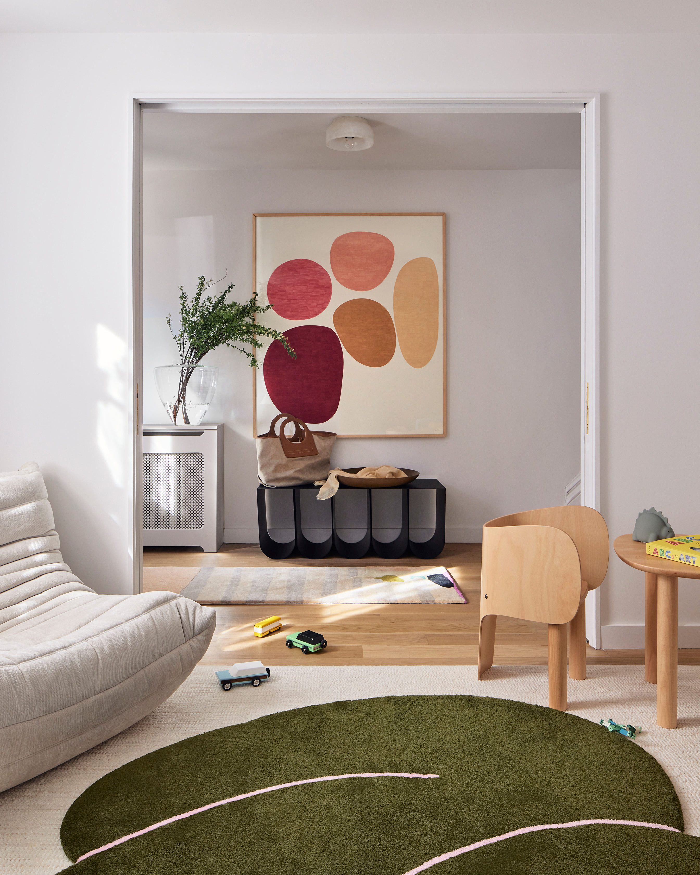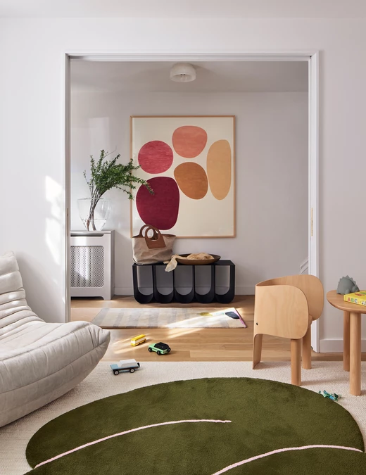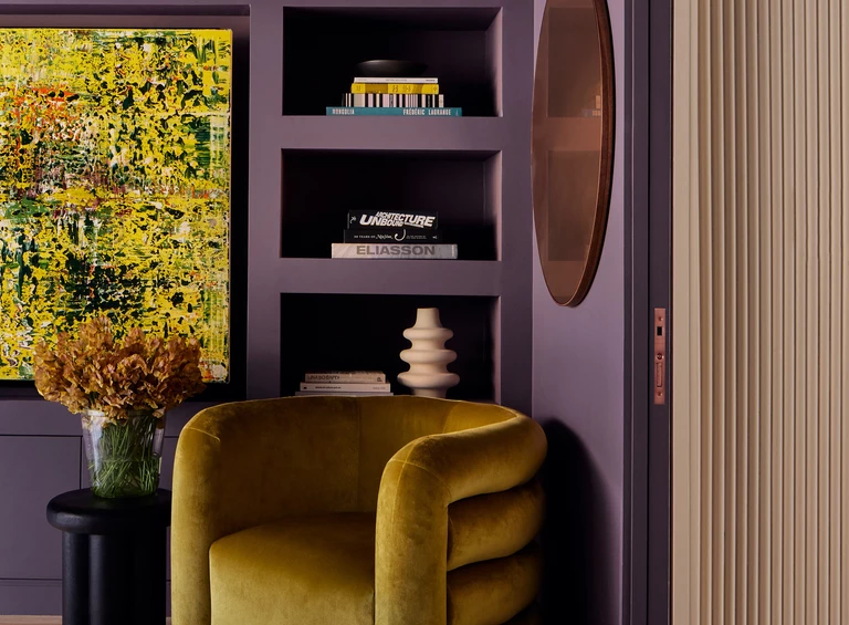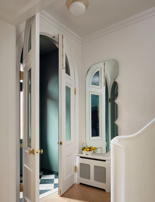 Już od wejścia wita nas odważna paleta barw. Ściany pomalowano na głęboką zieleń, a tradycyjną czarno-białą szachownicę na podłodze zastąpiono jej wariacją w odcieniach zieleni i różu. W salonie kontynuowana jest gra płynnych linii – zakrzywiona sofa i fotel otaczają zestaw marmurowych stolików na dywanie o organicznym kształcie. Dramatyczne przejście w głąb domu tworzy głęboki, żłobiony łuk z tynku, w którym ukryto bar oświetlony francuskimi kinkietami w stylu vintage.