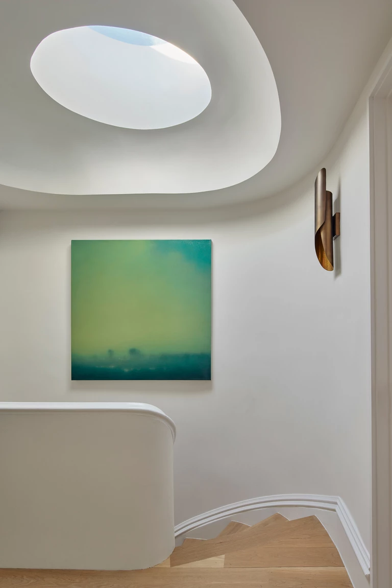 Na najwyższym piętrze każde z pomieszczeń opowiada własną historię kolorystyczną: w jednej z sypialni ścianę zdobi tapeta w łuki z akcentami kwaśnej zieleni, w drugiej króluje łóżko obite zielonym aksamitem, flankowane stolikami nocnymi z trawertynu.