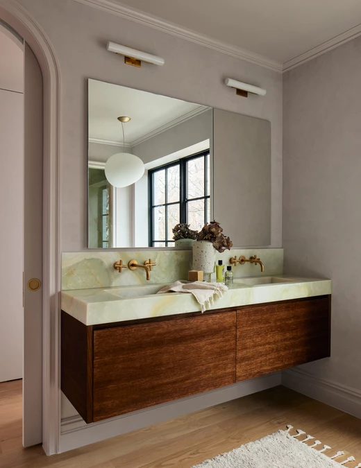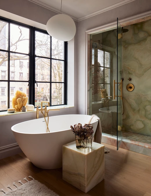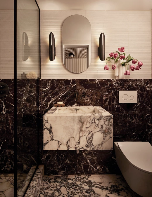 Prawdziwy spektakl odbywa się jednak w łazienkach na wyższych piętrach – w głównej prysznic wyłożono zielonym onyksem i marmurem Rosa Aurora Macchia Vecchia, a w gościnnej marmur Espectaculo pokrywa ściany i podłogę.