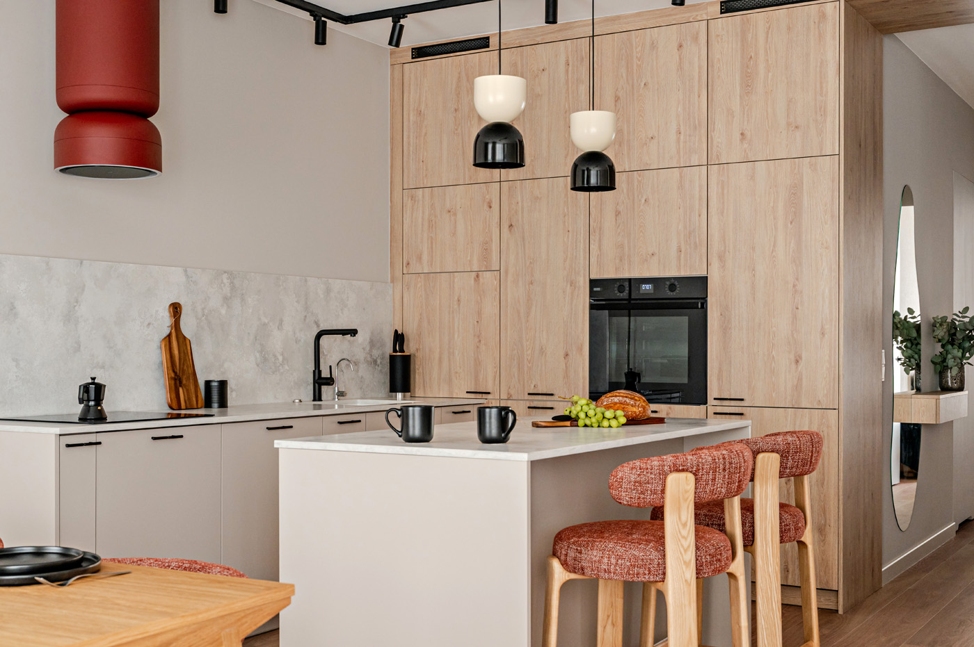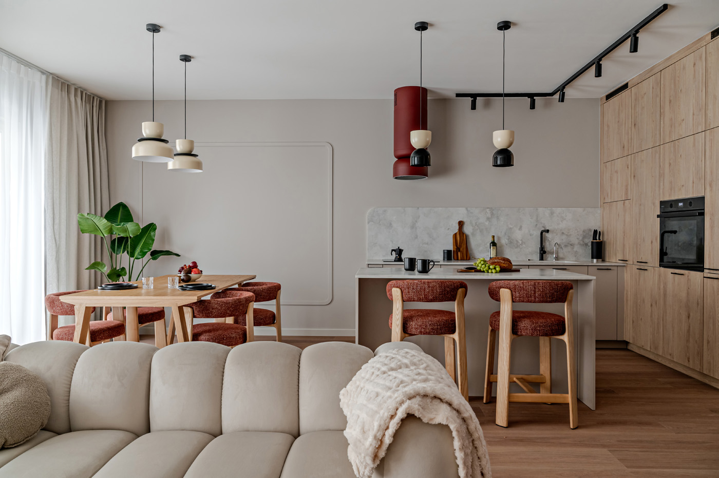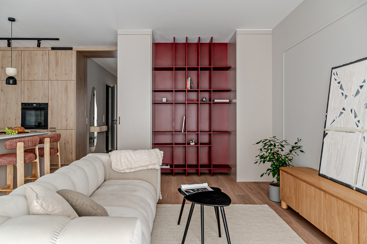 Istotnym założeniem projektu było promowanie rodzimego wzornictwa, co widać w wykorzystaniu armatury polskiej marki Deante oraz mebli od DeeHome. Neutralne tło przełamują wyraziste dominanty kolorystyczne, takie jak burgundowy okap marki Ciarko czy regał w salonie, które nadają wnętrzu indywidualny charakter.
