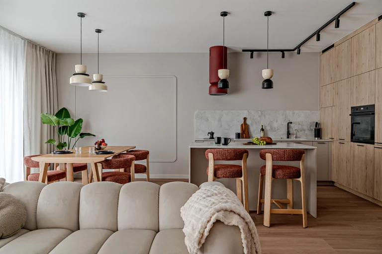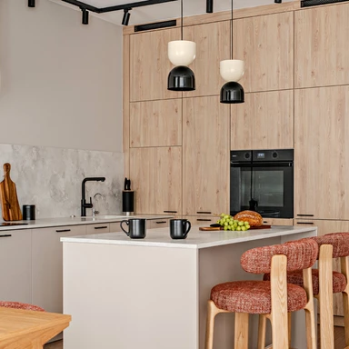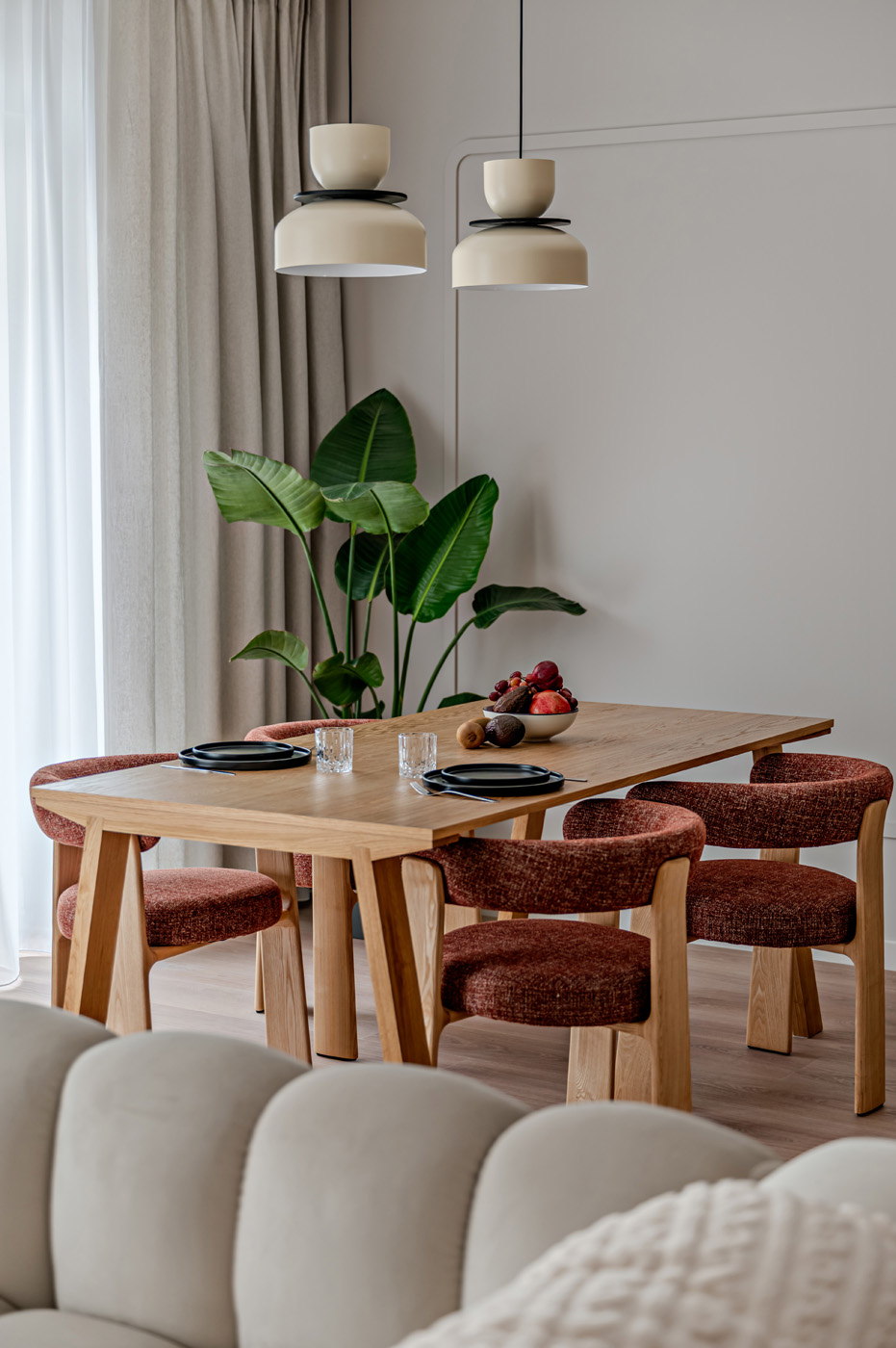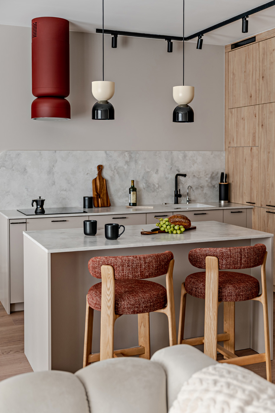 Istotnym założeniem projektu było promowanie rodzimego wzornictwa, co widać w wykorzystaniu armatury polskiej marki Deante oraz mebli od DeeHome. Neutralne tło przełamują wyraziste dominanty kolorystyczne, takie jak burgundowy okap marki Ciarko czy regał w salonie, które nadają wnętrzu indywidualny charakter.