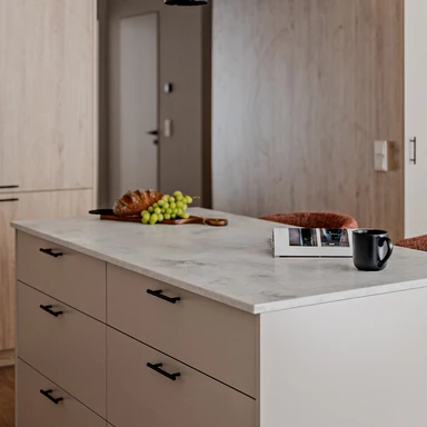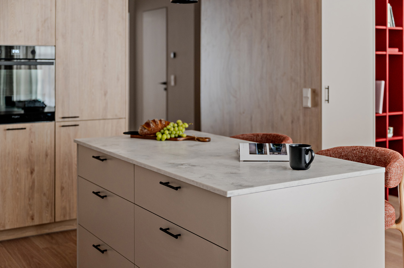 W doborze materiałów postawiono na szlachetność dębowego drewna, trwałość blatów z kwarcogranitu oraz jednolitą podłogę z paneli winylowych Barlinek, która prowadzi użytkownika przez całe mieszkanie.