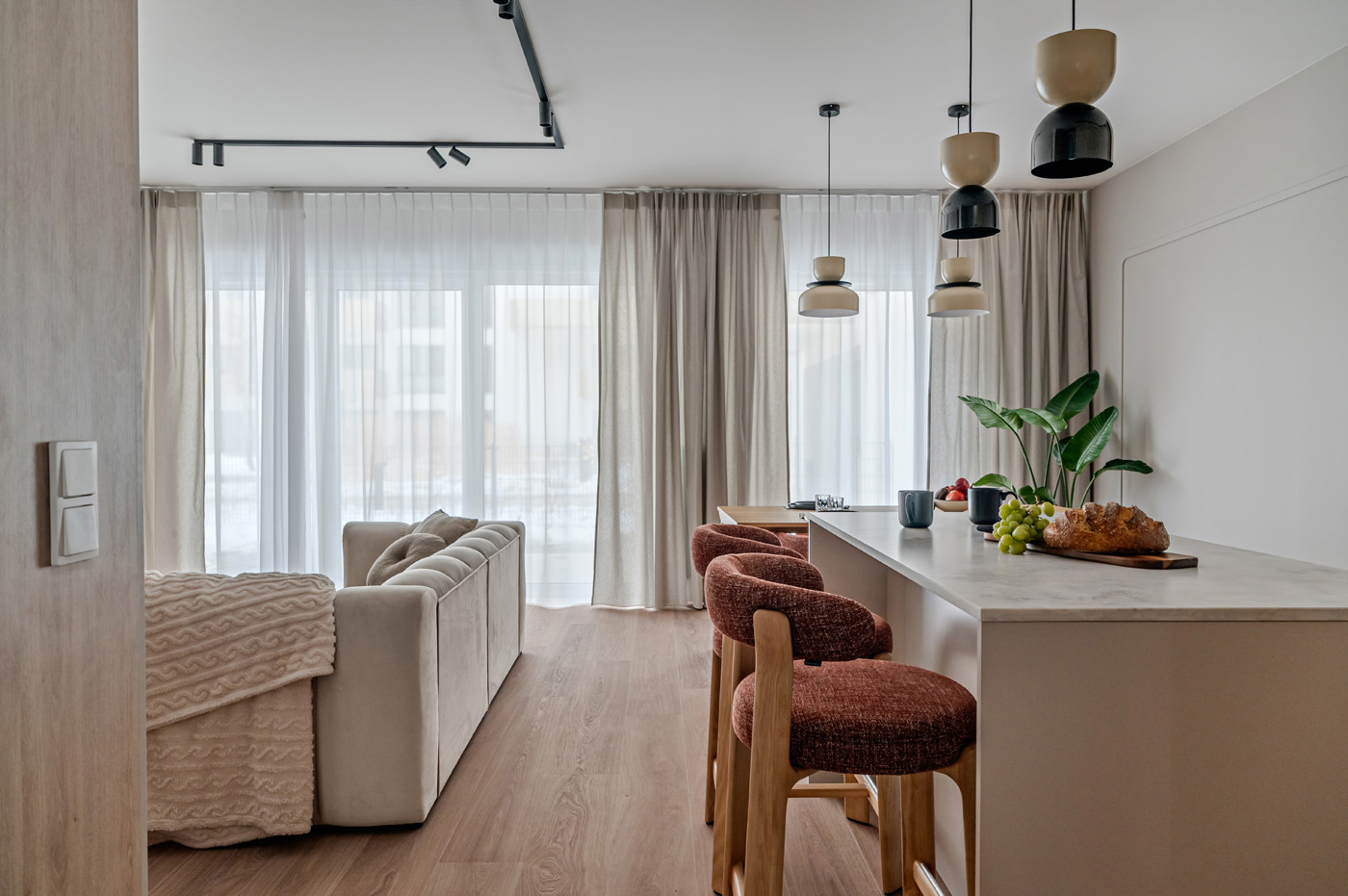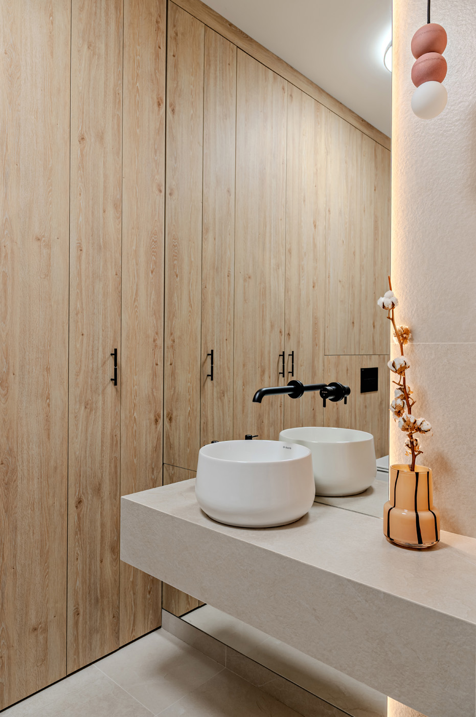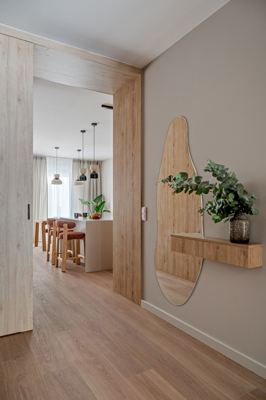 Estetyka wnętrza opiera się na nurcie minimalistycznym z elementami dekometrii, gdzie duże, drewniane i szaro-beżowe płaszczyzny płynnie przechodzą między poszczególnymi pomieszczeniami. Surowość bazy została ocieplona zaoblonymi formami, które pojawiają się w oprawach oświetleniowych, uchwytach meblowych oraz lustrach o miękkich krawędziach.
