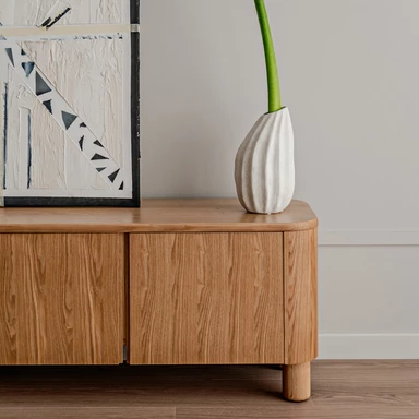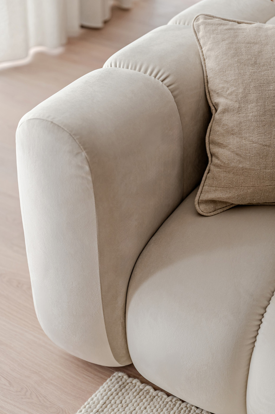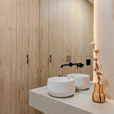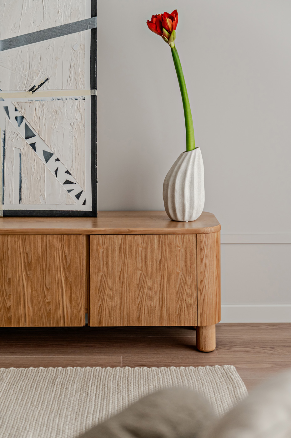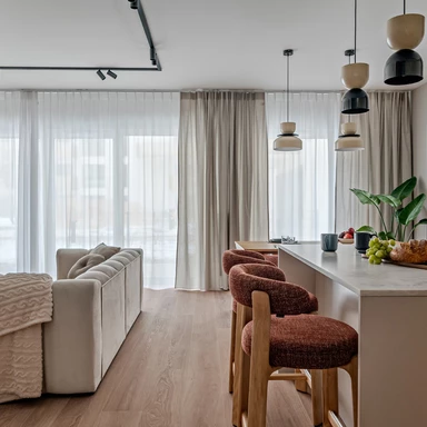 Estetyka wnętrza opiera się na nurcie minimalistycznym z elementami dekometrii, gdzie duże, drewniane i szaro-beżowe płaszczyzny płynnie przechodzą między poszczególnymi pomieszczeniami. Surowość bazy została ocieplona zaoblonymi formami, które pojawiają się w oprawach oświetleniowych, uchwytach meblowych oraz lustrach o miękkich krawędziach.