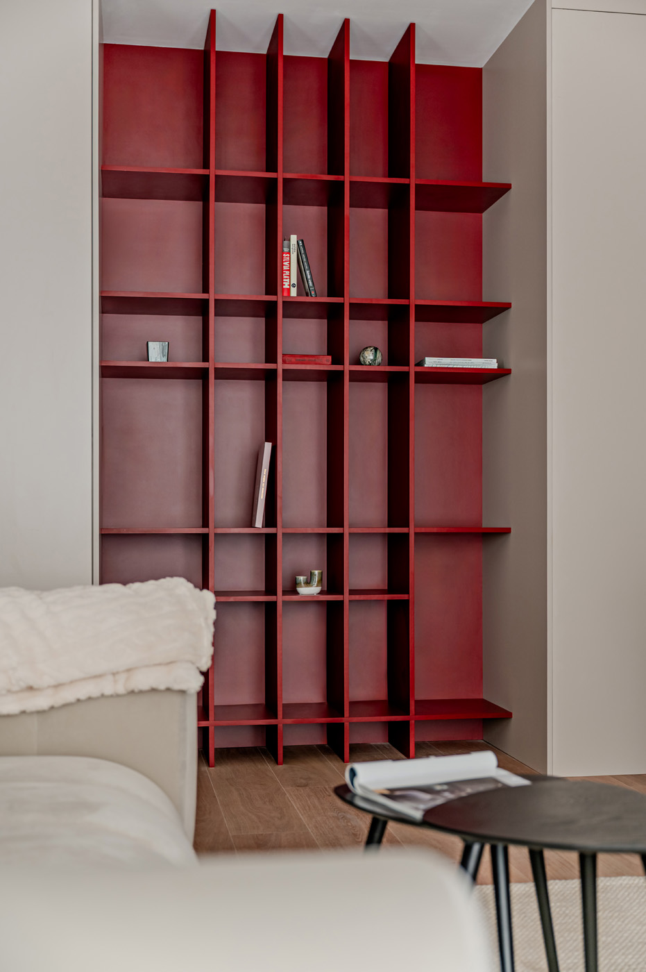 Ważnym elementem kompozycyjnym są ukryte drzwi, wzmacniające wrażenie wizualnej czystości, oraz dbałość o zachowanie pionowych płaszczyzn bez przypadkowych podziałów.