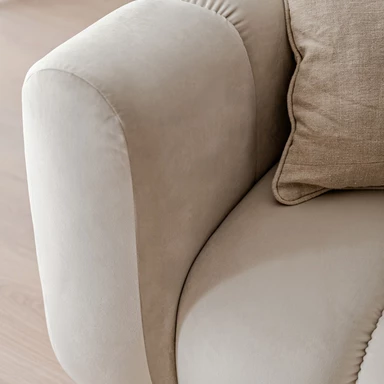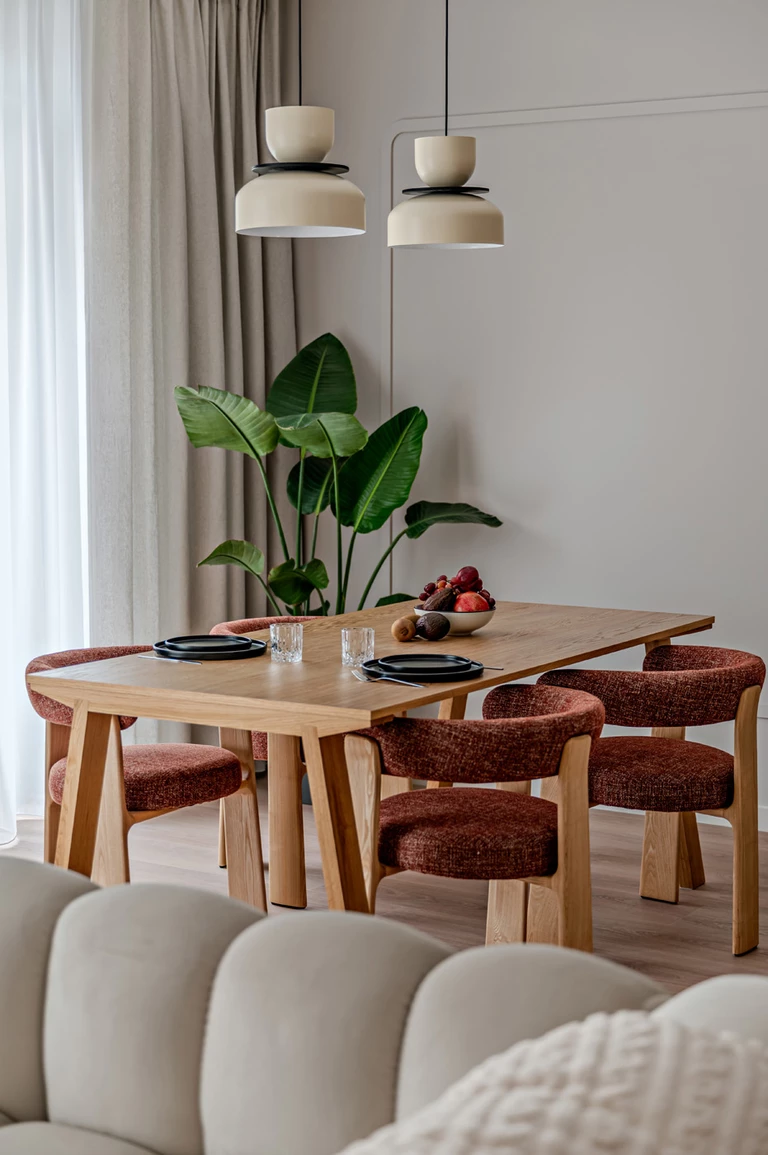 Całość dopełniają miękkie tkaniny szenilowe w odcieniach terakoty, wprowadzające do przestrzeni głębię i przyjemną atmosferę.