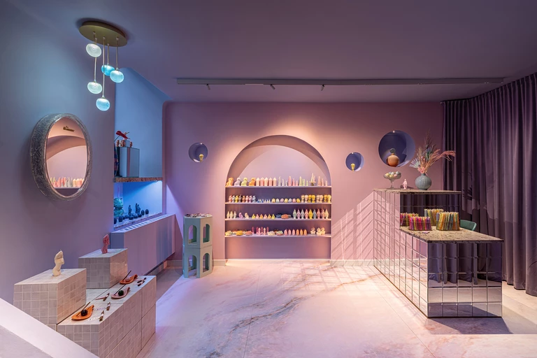 Na podłodze znalazła się winylowa wykładzina z marmurowym wzorem, która doskonale komponuje się z lustrzaną ladą z granitem, kojarzącą się z hotelowym lobby. Wzrok przyciąga fioletowa, welurowa kotara, poprowadzona przez połowę sklepu. Nie zabrakło tu sztuki oraz mebli i dodatków o wyrazistej formie. Stoliki i lustro vintage, gipsowe popiersie Marii Antoniny, taborety „Altanka” projektu Lapolka czy ceramika Malwiny Konopackiej tworzą razem wyjątkowo atrakcyjną całość.