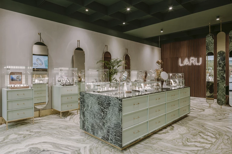 Butik z biżuterią LARU w Gdyni – mimo że ma jedynie 50 metrów kwadratowych powierzchni – wyróżnia się przestronnością. To zasługa Karola Mikulskiego, założyciela pracowni SAM Architekci, autora przestrzeni. Zaaranżował lokal jednostrefowy, w którym rozlokował funkcje w sposób otwarty na klientów. Projektując wnętrze, zainspirował się zielenią tarczy zegarków Rolex oraz modernistyczną spuścizną Gdyni.