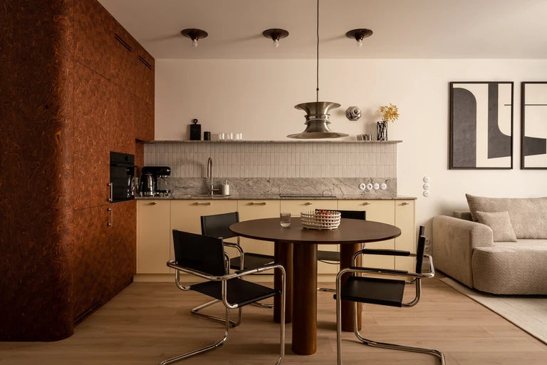 Głównym założeniem aranżacji było wykreowanie nowoczesnej przestrzeni, która nawiązuje do modernistycznej historii Gdyni. Miało się tu również znaleźć miejsce na dodatki vintage. Ostatecznie bazą koncepcji stała się wszechobecna marmurowa mozaika w odcieniach beżu i burgundu oraz kolor maślany, który w tym roku podbił serca estetów. Tę barwę zestawiono z eleganckim fornirem – oba motywy wykorzystano do projektu zabudowy kuchennej. Obła forma tego mebla jest wyraźnie inspirowana stylistyką mid-century modern. W kompozycji nie zabrakło również akcentów miedzi, modnych elementów chromowanych oraz drewna, które kontrastuje z miękkimi tkaninami.