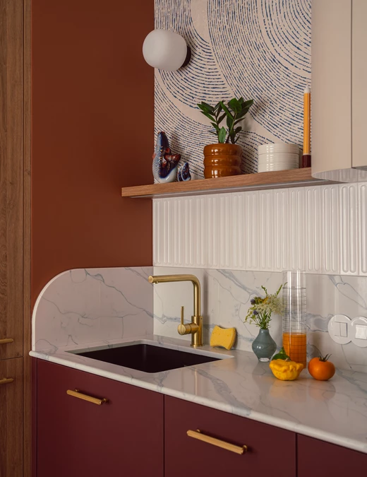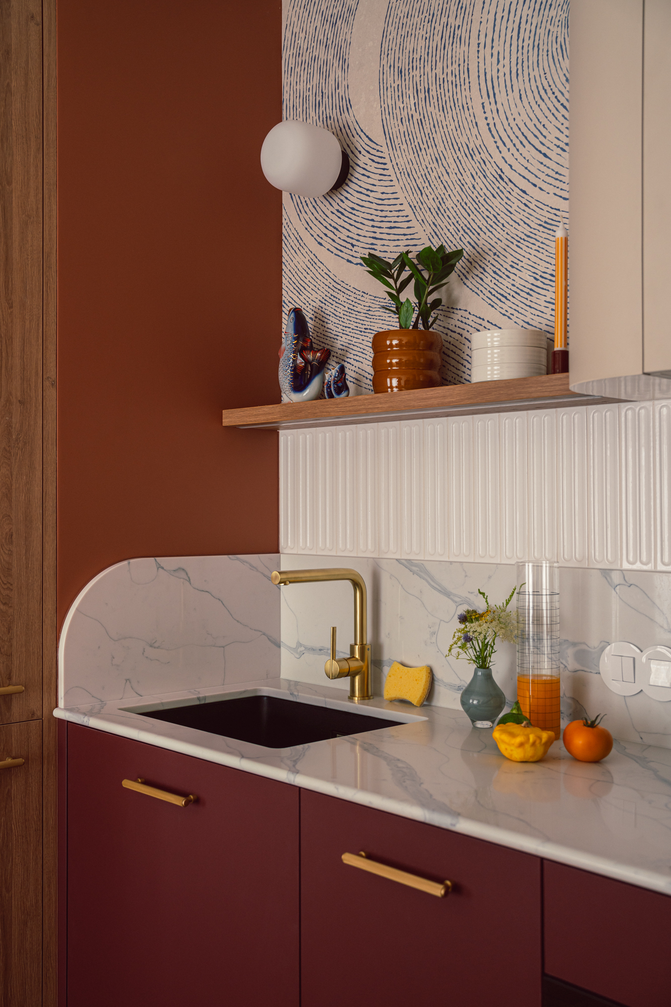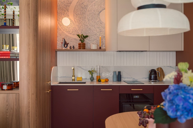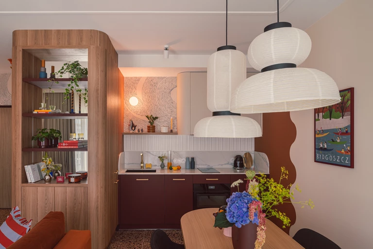 Otwarta strefa dzienna obejmuje kuchnię ukrytą w wysokiej zabudowie, część jadalnianą i wypoczynkową. Dolne fronty kuchenne w kolorze głębokiego burgundu harmonizują z różowymi płytkami ceramicznymi na podłodze, a zaoblone, beżowe szafki górne i blat nawiązują do pozostałych elementów wystroju.