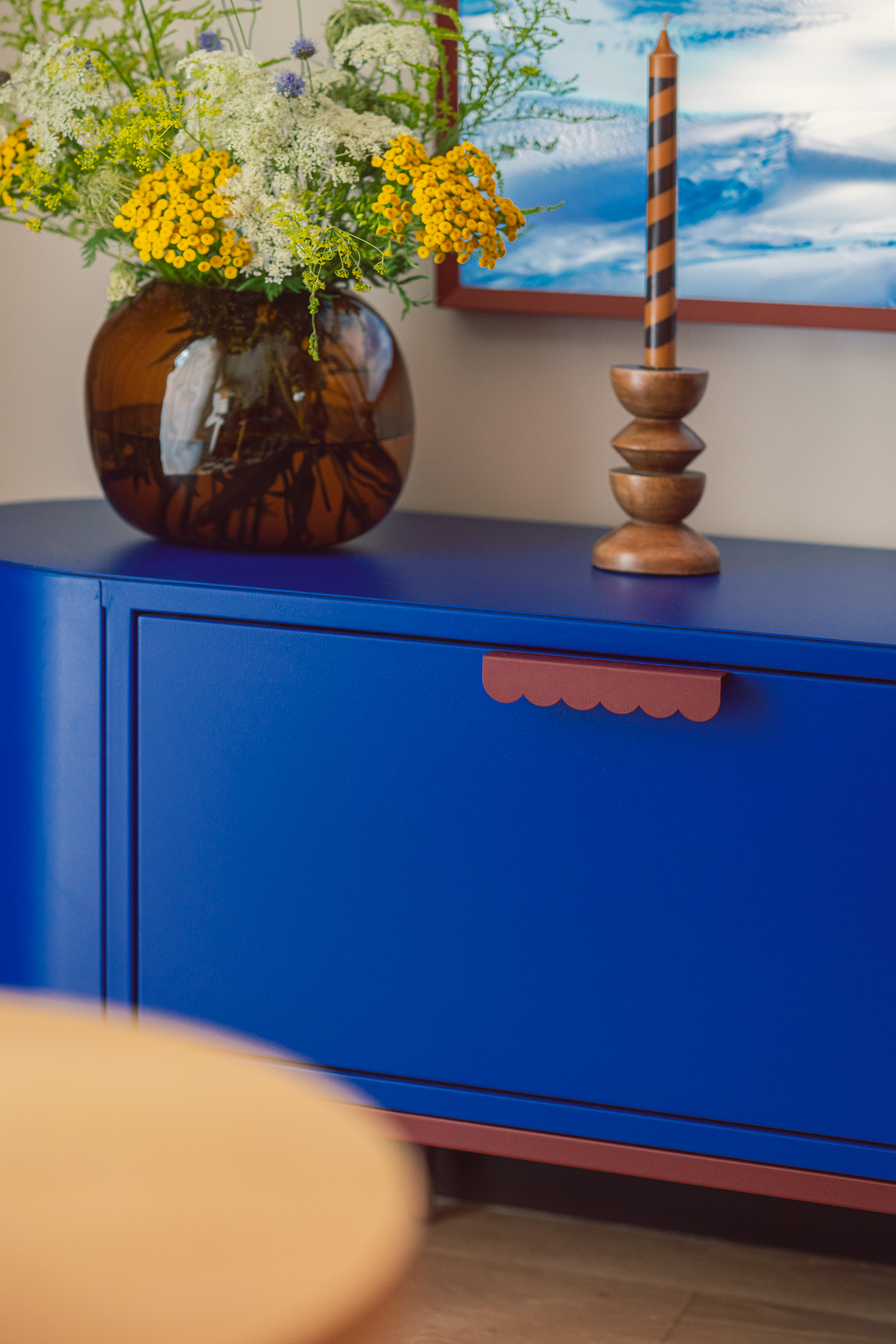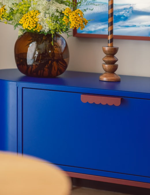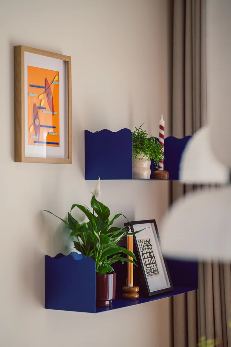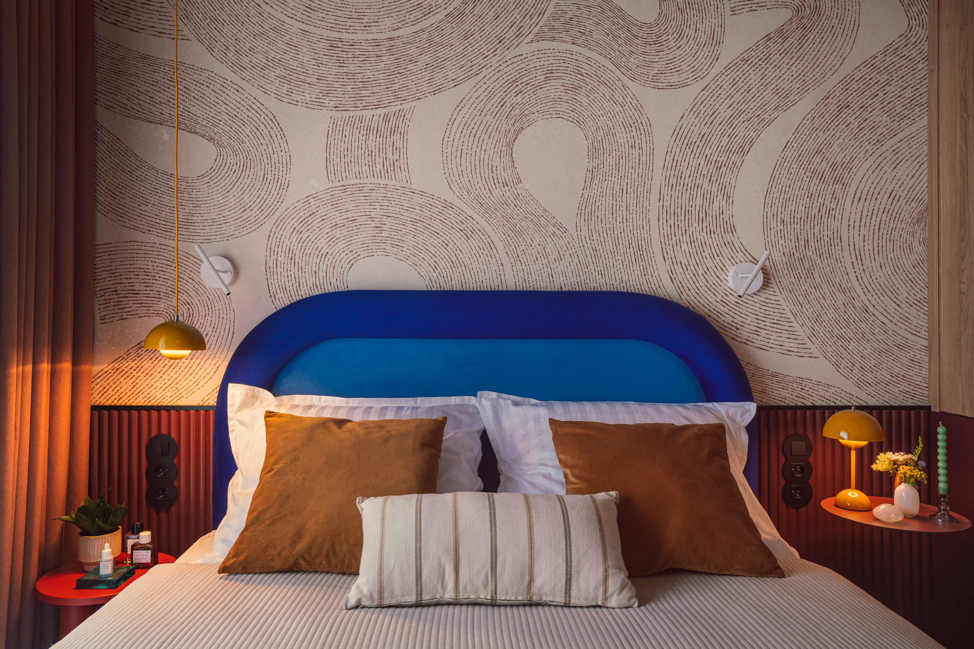 Motyw wody ułatwił stworzenie spójnej palety barw. Dominują odcienie niebieskiego – od subtelnych, pastelowych tonów po mocne, nasycone barwy – zestawione z głębokim burgundem, który pojawia się w kuchni i łazience, oraz złamanym różem. Kompozycję dopełnia ciepły, rudy akcent. Ściany i sufity pozostawiono białe, by wyeksponować odważne połączenia kolorystyczne. W sypialni postawiono na ciepło, przytulność i intymny nastrój. Zastosowano w niej tę samą paletę barw, lecz odwrócono proporcje – dominuje rudy kolor.
