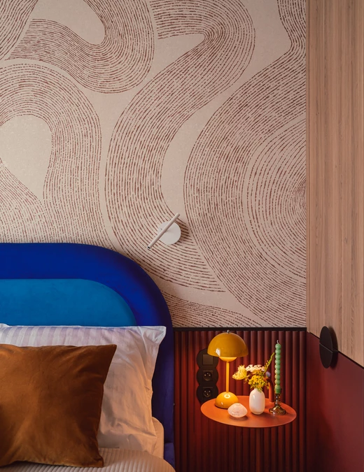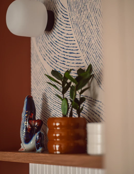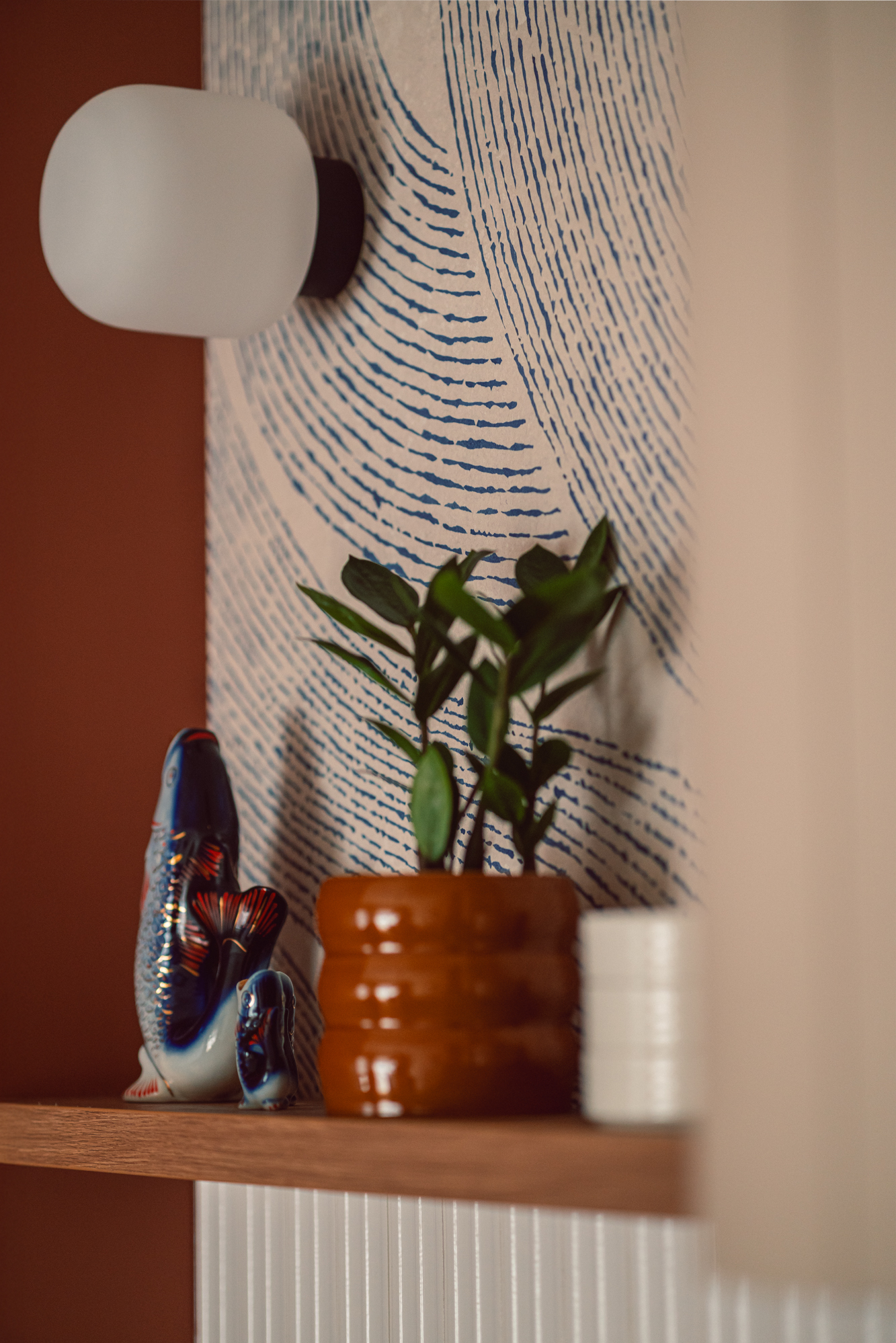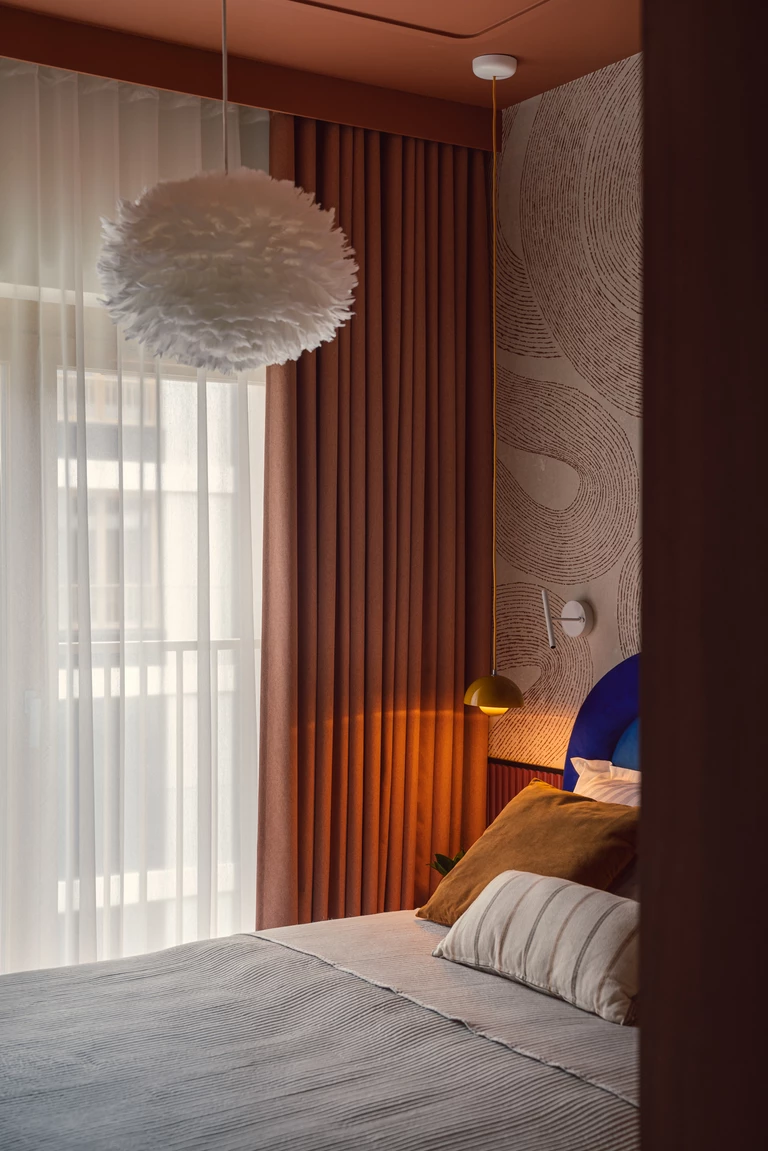 Sypialnia to przytulne, ciche miejsce do odpoczynku. Rudy kolor przewija się na suficie, zasłonach i tapecie Sandberg za wezgłowiem łóżka (w innej wersji kolorystycznej niż w pozostałych pomieszczeniach). Kompozycję uzupełniają burgundowe lamele, kontrastujące wezgłowie marki Happy Barok oraz ikoniczna, miodowa lampa Flowerpot, która dodaje wnętrzu uroku.