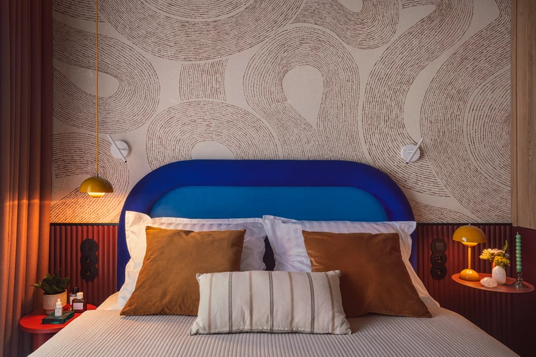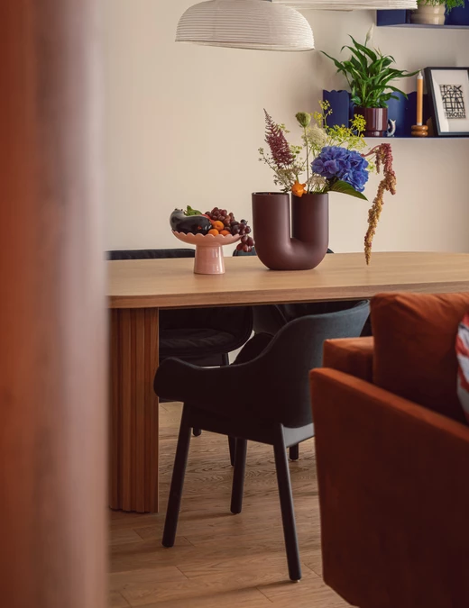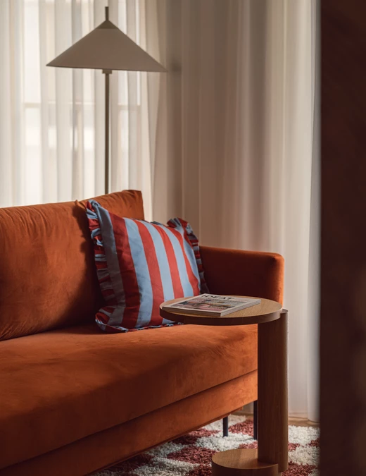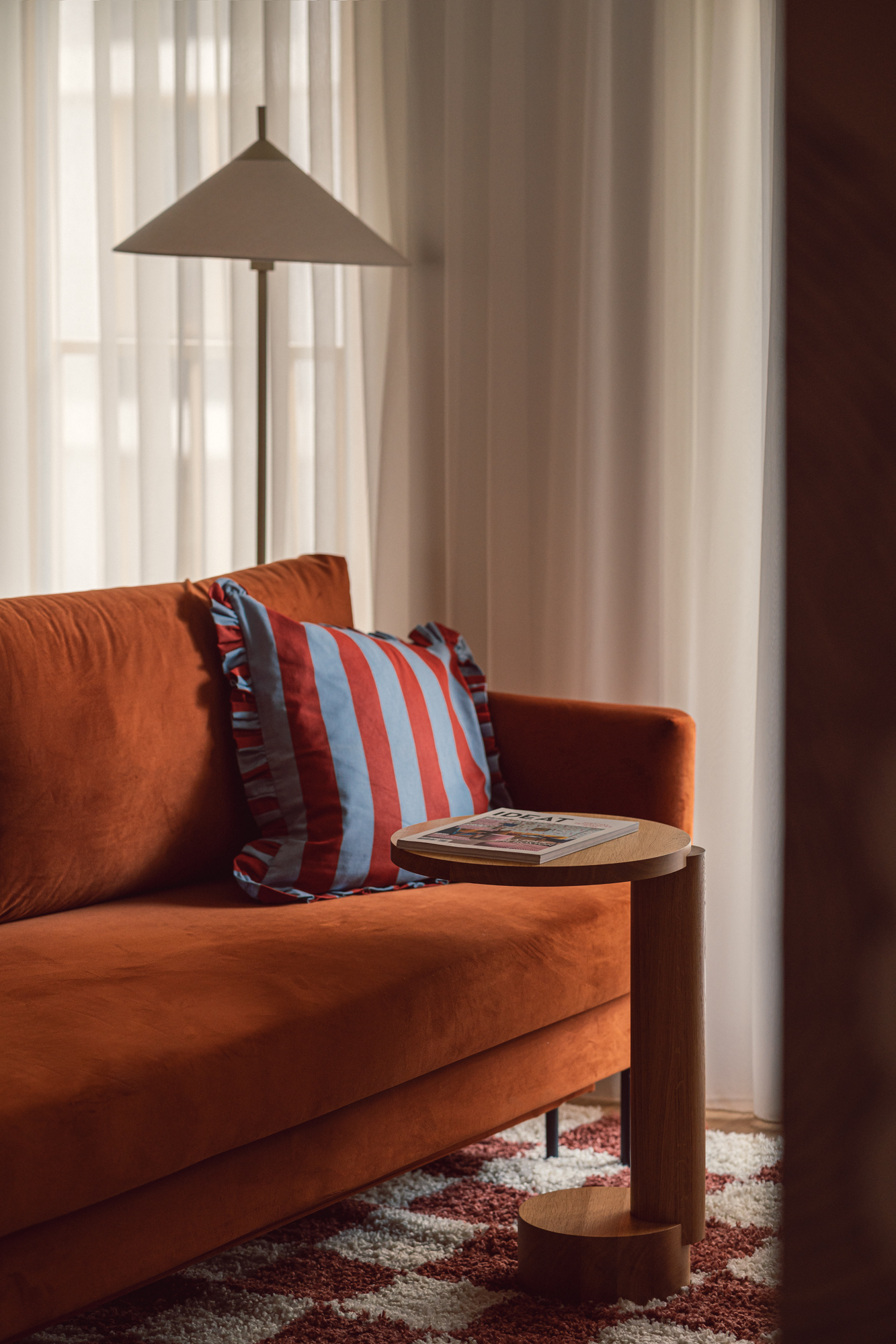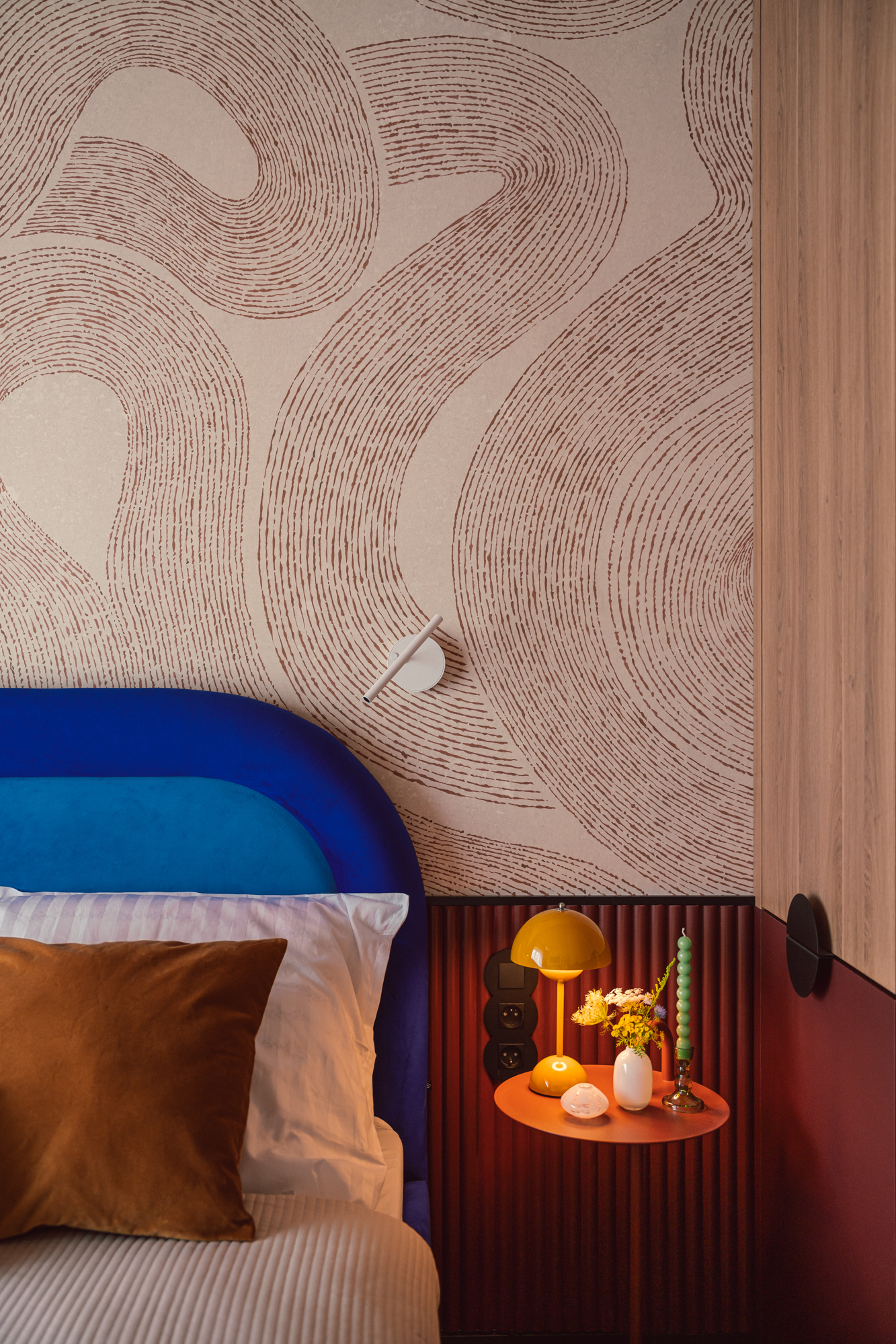 Sypialnia to przytulne, ciche miejsce do odpoczynku. Rudy kolor przewija się na suficie, zasłonach i tapecie Sandberg za wezgłowiem łóżka (w innej wersji kolorystycznej niż w pozostałych pomieszczeniach). Kompozycję uzupełniają burgundowe lamele, kontrastujące wezgłowie marki Happy Barok oraz ikoniczna, miodowa lampa Flowerpot, która dodaje wnętrzu uroku.