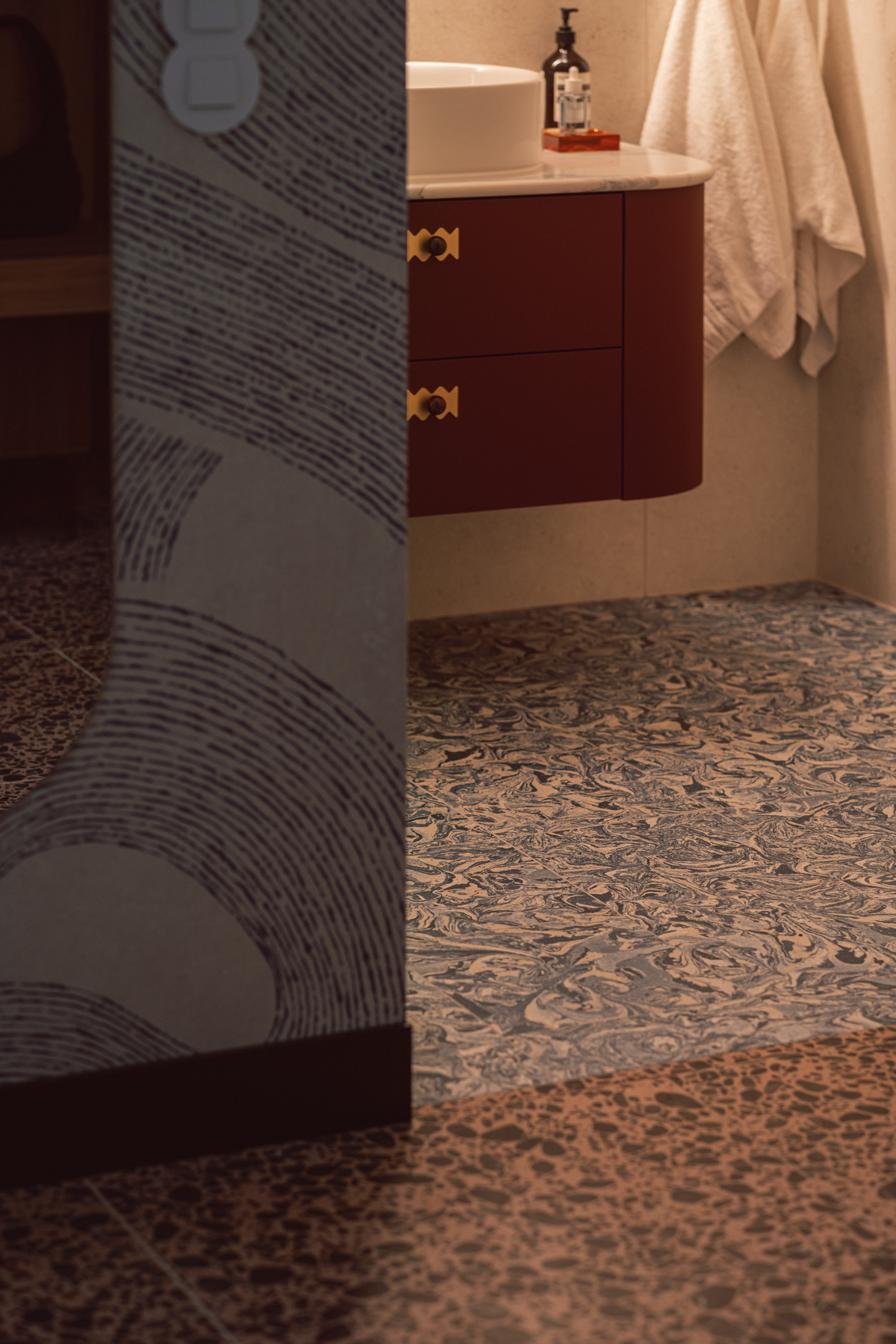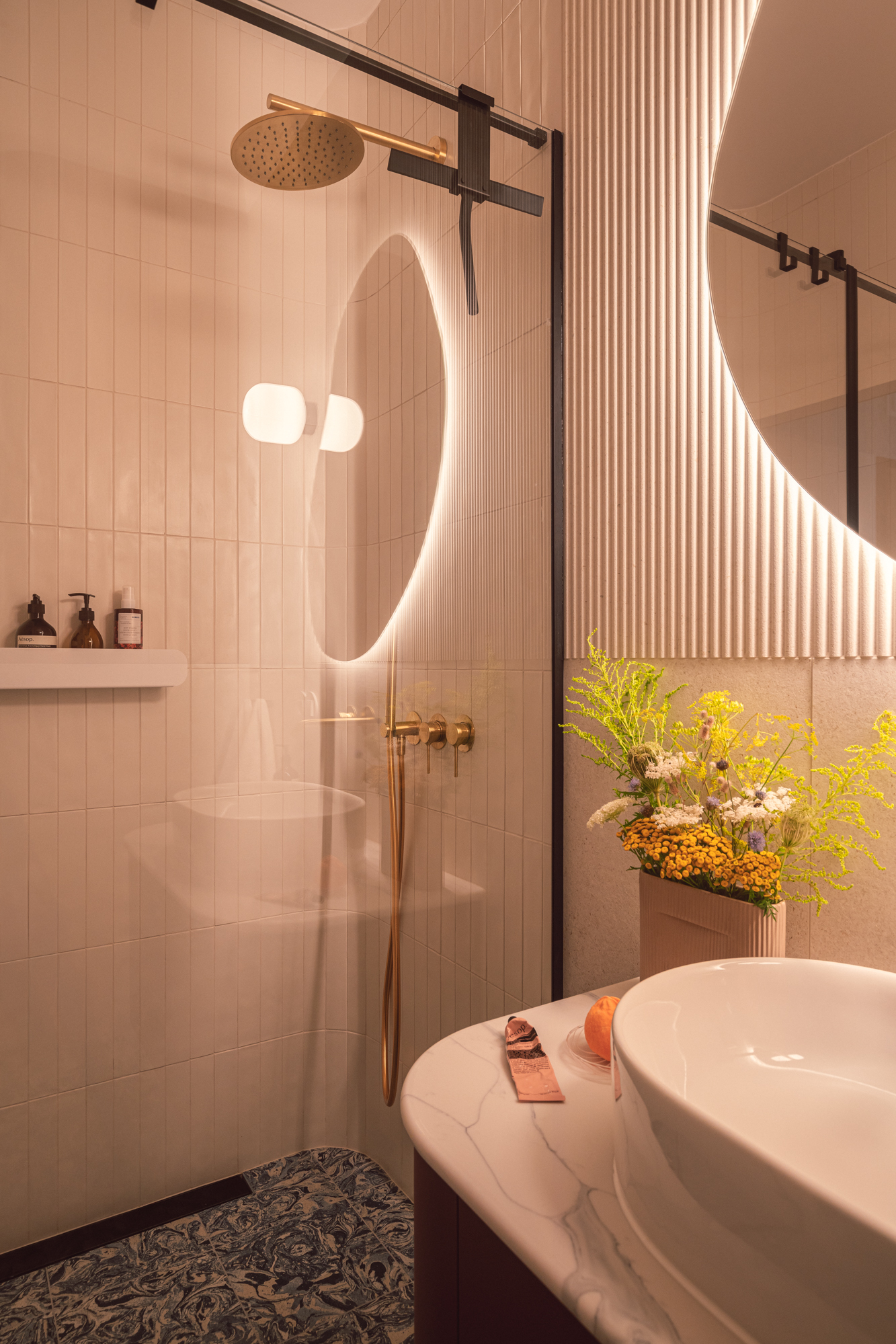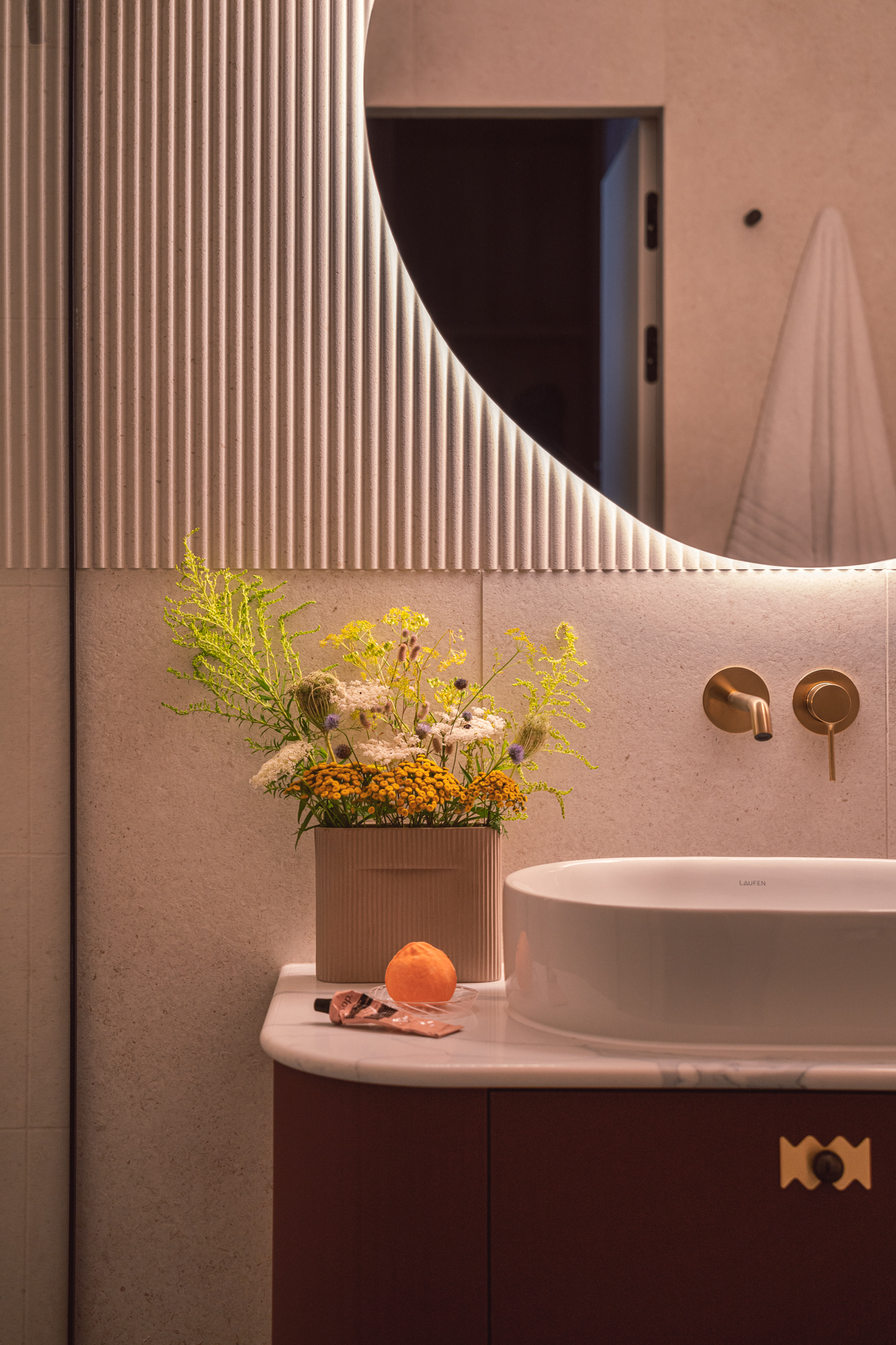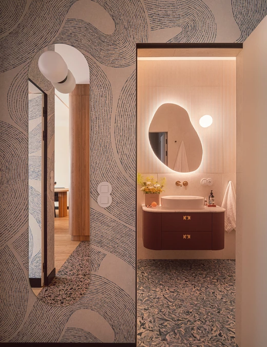 W łazience zastosowano płytki marki Arcana imitujące powierzchnię wody. Bordowa szafka umywalkowa kontrastuje z wyrazistą podłogą, a reszta pomieszczenia utrzymana jest w neutralnych tonach beżu i bieli. Organiczne formy – od zaokrąglonego blatu i strefy prysznicowej, przez frezowane płytki, po lustro o miękkiej linii – konsekwentnie podtrzymują założenia projektowe.
